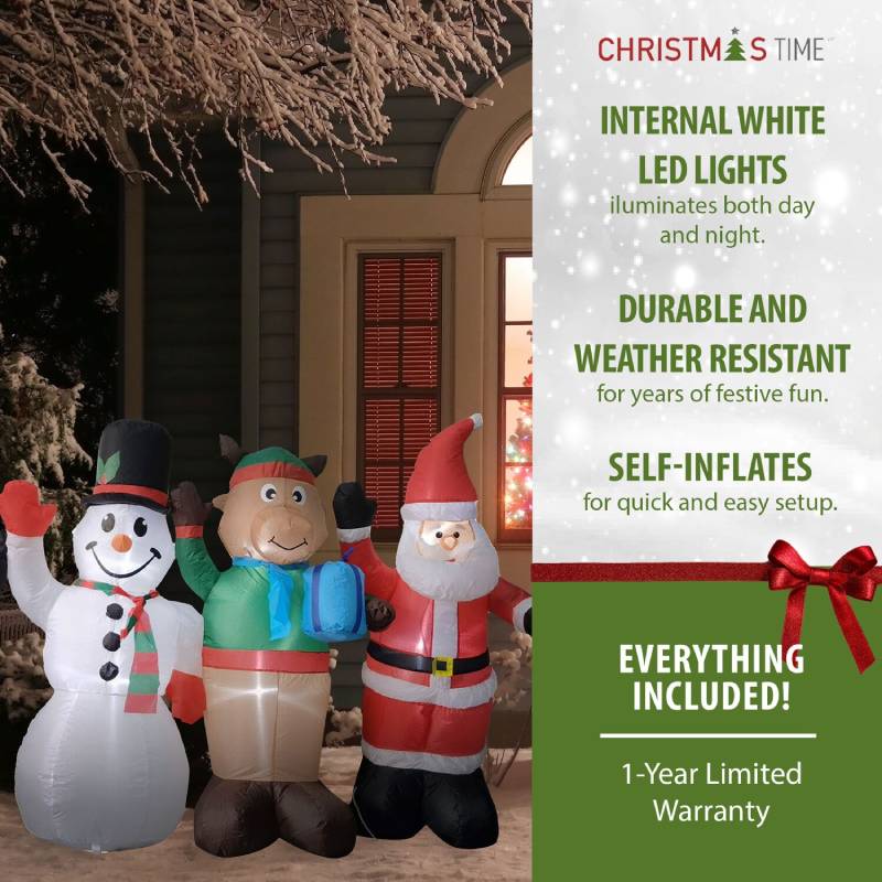 Welcome guests and the holiday season with a pre-lit jumbo inflatable from Christmas Time. Celebrate with one of our festive, air blown inflatables or collect them all to design your very own winter wonderland. Brighten your lawn, garden, backyard, open porch, or deck with this 4-ft. pre-lit inflatable Penguin, Snowman, Reindeer, and Santa Claus Friends, and get ready to spread some holiday cheer. This eye-catching decoration will draw visitors to your home through sheer Christmas magic, with a little help from its colorful design and impressive size.