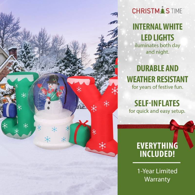 Welcome guests and the holiday season with a pre-lit jumbo inflatable from Christmas Time. Celebrate with one of our festive, air blown inflatables or collect them all to design your very own winter wonderland. Brighten your lawn, garden, backyard, open porch, or deck with this 4.5-ft. pre-lit inflatable JOY Snowglobe, and get ready to spread some holiday cheer. This eye-catching decoration will draw visitors to your home through sheer Christmas magic, with a little help from its colorful design and impressive size.