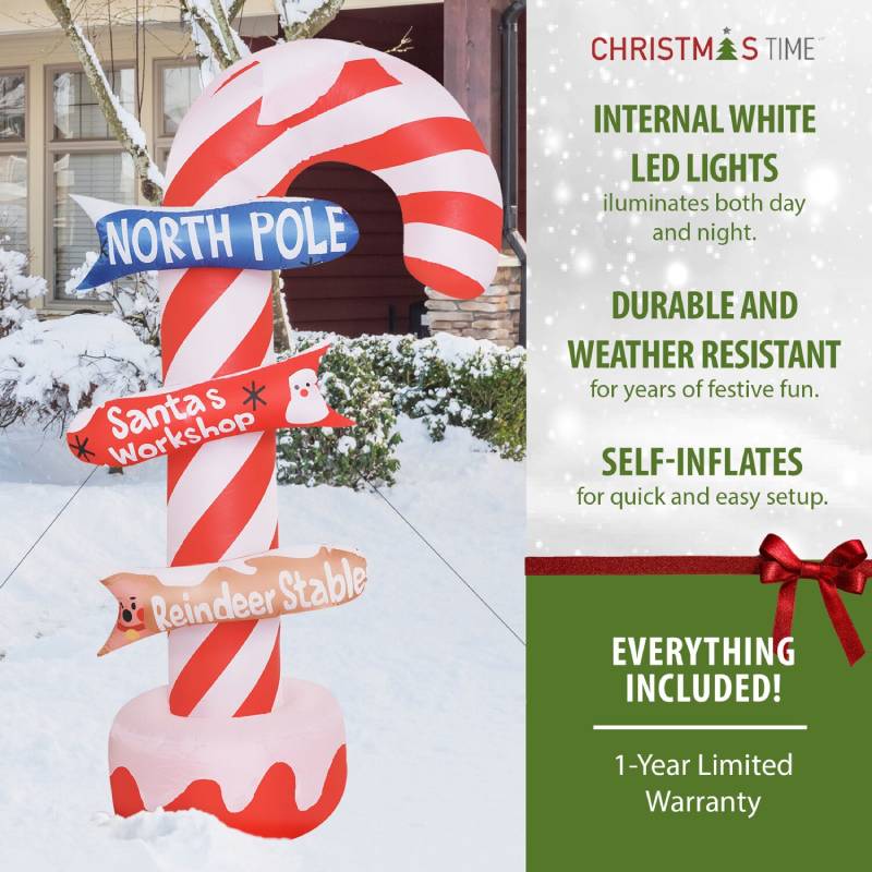 Welcome guests and the holiday season with a pre-lit jumbo inflatable from Christmas Time. Celebrate with one of our festive, air blown inflatables or collect them all to design your very own winter wonderland. Brighten your lawn, garden, backyard, open porch, or deck with this 6-ft. pre-lit inflatable Candy Cane Direction Sign, and get ready to spread some holiday cheer. This eye-catching decoration will draw visitors to your home through sheer Christmas magic, with a little help from its colorful design and impressive size. Once you receive your inflatable, you’ll be moments away from having the best decorated house on the block, thanks to your new inflatable’s quick and easy setup. Everything you need is included in your package – air blower, ropes, and stakes. Unpack it, plug it in, stake it down, then enjoy as the fun unfolds. Celebrate the holidays in a big way with quality products from Christmas Time.