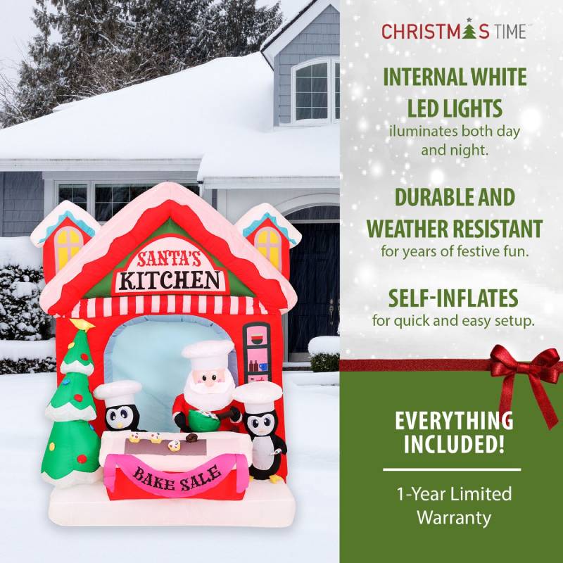 - 7-Ft. pre-lit inflatable Santa’s Kitchen with 9 internal white LED lights by Christmas Time