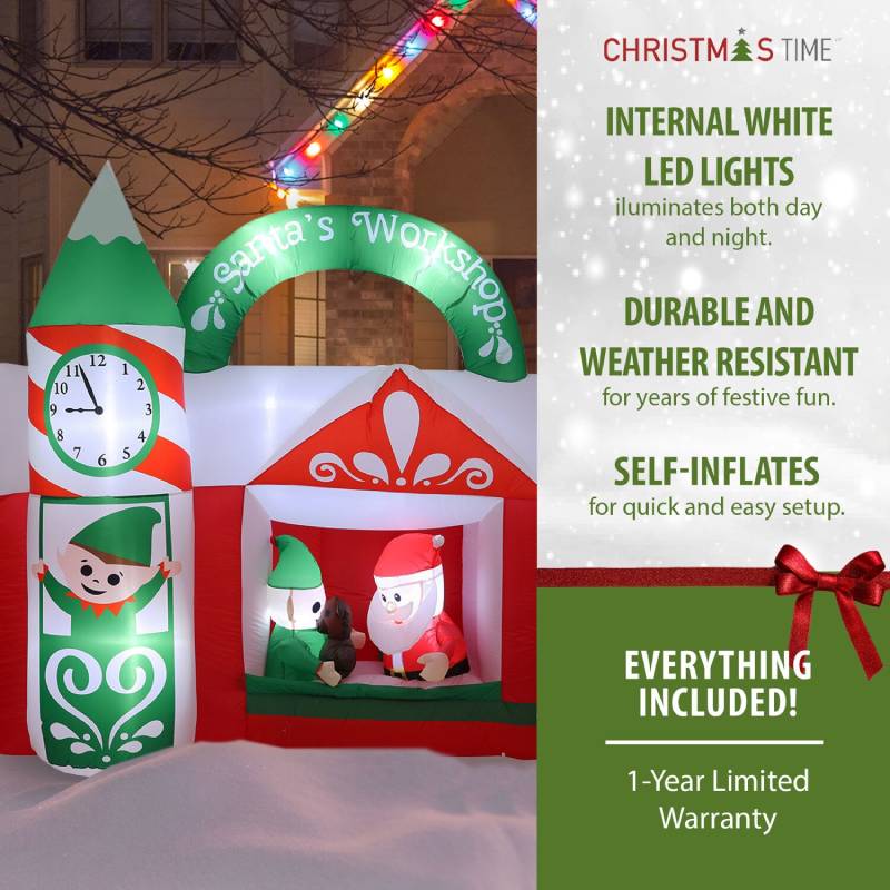 - 6-Ft. wide pre-lit inflatable Santa’s Workshop with 9 internal white LED lights by Christmas Time