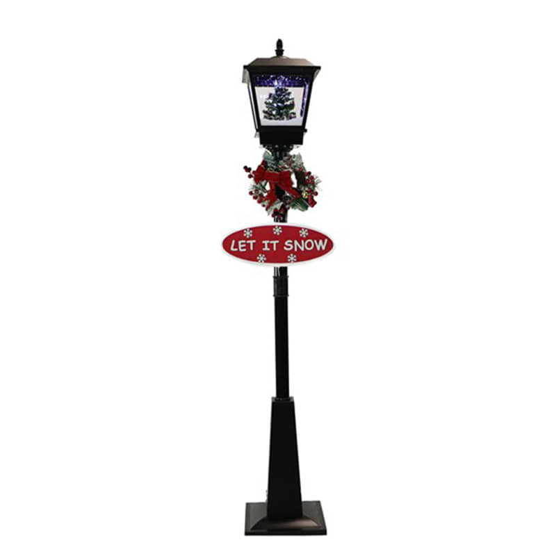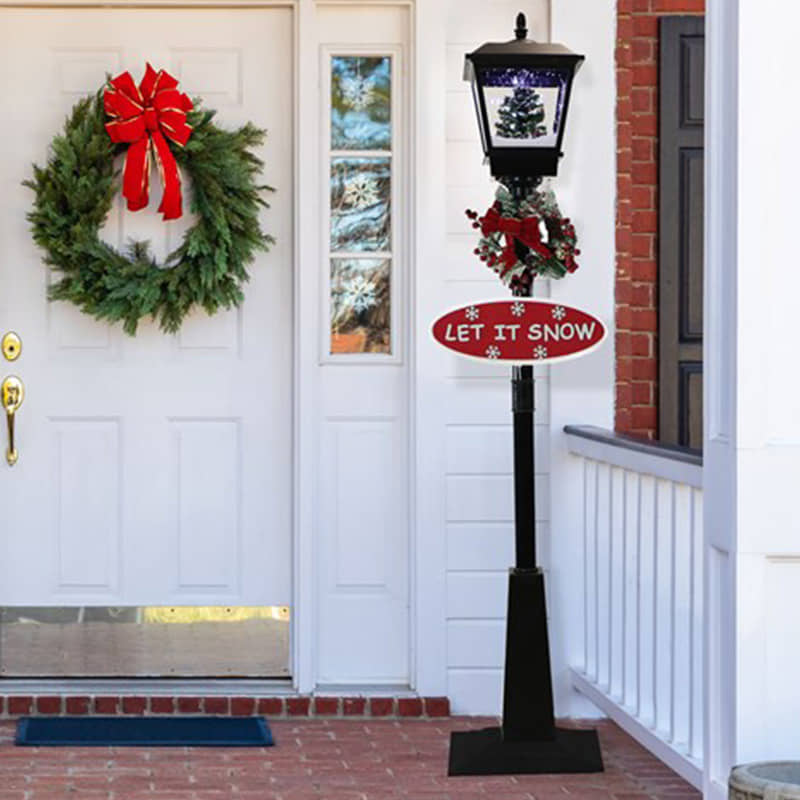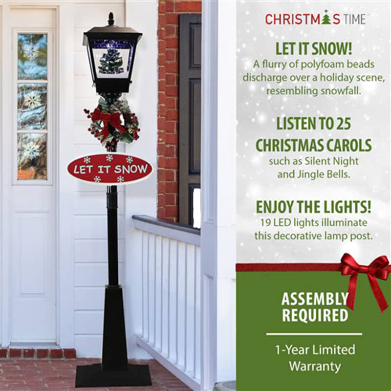 Greet your guests with this 71-inch Musical Snowy Street Lamp from Christmas Time. This snowy lamp produces flurries of faux snow that fall over various holiday scenes. Watch as brightly lit snow cascades over a decorated tree scene while your favorite Christmas Carols play in the background. Sing along to 25 family favorites such as Jolly Old Saint Nicholas, The Twelve Days of Christmas, Joy to the World, and many more. The magic of the holidays is truly embodied in this decorative lamp post with two festive signs (Let it Snow and Merry Christmas), a berry-covered wreath, and a classic red bow. This unique holiday street lamp will help create a magical winter wonderland on your porch, walkway, driveway, or anywhere else in your yard. Simply plug it in and let it snow, let it snow, let it snow!