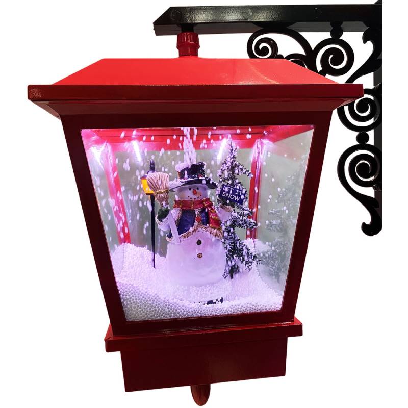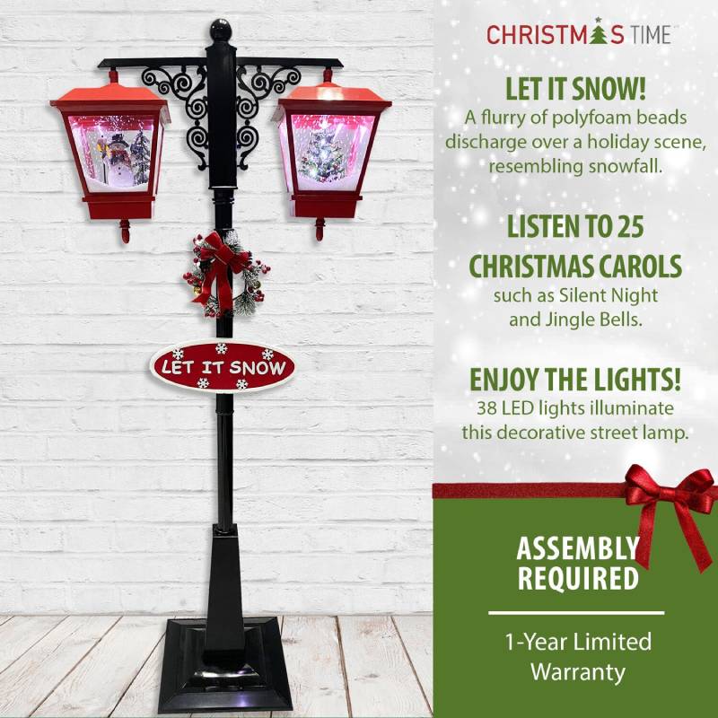 Light the night with a Dual-Lantern Musical Snowy Street Lamp from Christmas Time. Our snowy lamps produce flurries of faux snow that fall over various holiday scenes. Standing 74 inches tall, this amazing holiday lamp post features two musical snow lanterns – one with a snowman scene and one with a Christmas tree scene. Snow dances playfully over each scene while your favorite Christmas Carols play, including 25 family favorites such as Jolly Old Saint Nicholas, The Twelve Days of Christmas, Joy to the World, and many more. Embellished with traditional scrollwork, a festive sign, a berry-covered wreath, and a classic red bow, this unique holiday street lamp will create a magical winter wonderland on your covered porch, walkway, or driveway. Simply plug it in and let it snow, let it snow, let it snow!