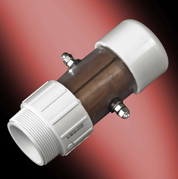 Replacement electrode for the new R-50 and AE-50 models, the R-20/R-40 models, the R-200 model from 25 years ago and many competitors. Unique one-piece capsule screws into any 2” threaded tee and keeps electrodes out of the direct flow of the water for longer wear and tear. Clear viewing window for cleaning and replacing purposes. Requires Teflon tape when screwing into tee. 3” long electrodes, 1 ¾” “half-moon” in diameter. Schedule 40 PVC.