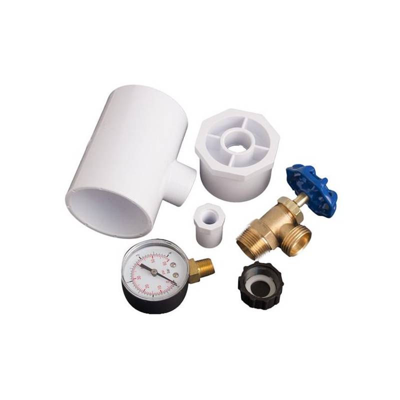 - Includes a 2” Socket x 2” Socket x 3/4” NPT main body, a Standard Garden Hose x 3/4” NPT Brass Faucet, a 2” Spigot x 1/2” Socket Adapter, a 1/2” Spigot x 1/4” NPT Adapter, and a Pressure Gauge.