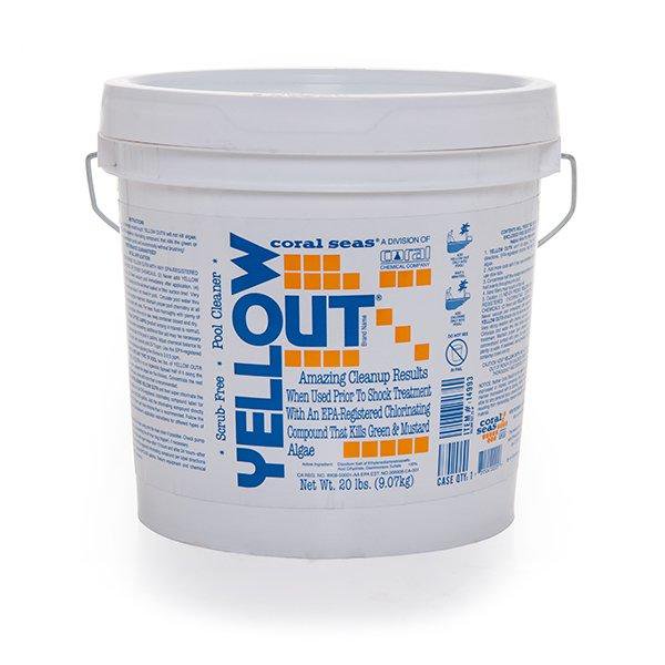 The Coral Seas 17616COR Yellow Out 20 lb Pail Use 2 lbs of Yellow Out per 15,000 gallons of water prior to shock treatment with chlorine starts working on algae instantly! Fast cleanup of green, mustard, brown or pink algae in just six steps. Green Aid enhances the power of chlorine when used after chlorine-based shock treatments. Safe for all pool surfaces. Scrub-free and leaves no metal residue behind that may stain your pool surface.