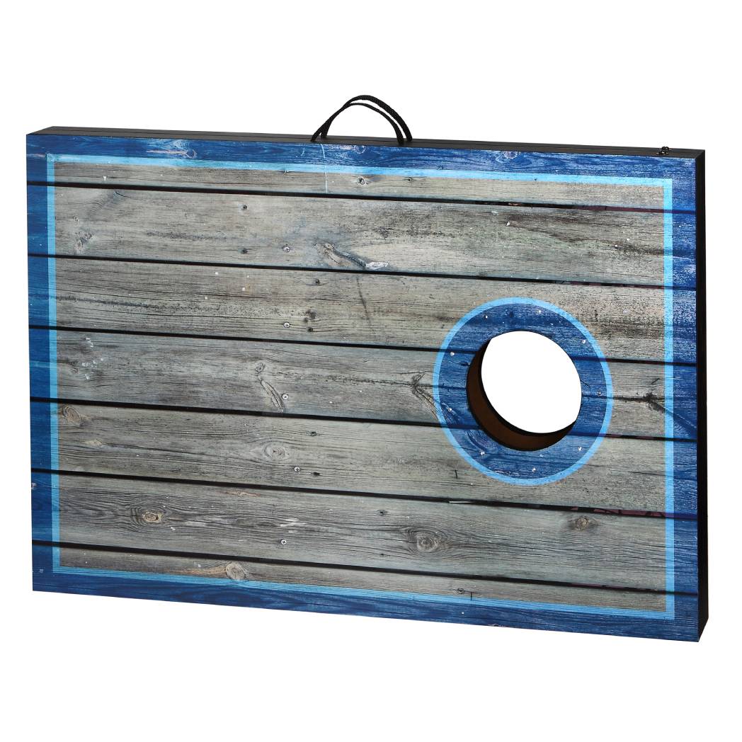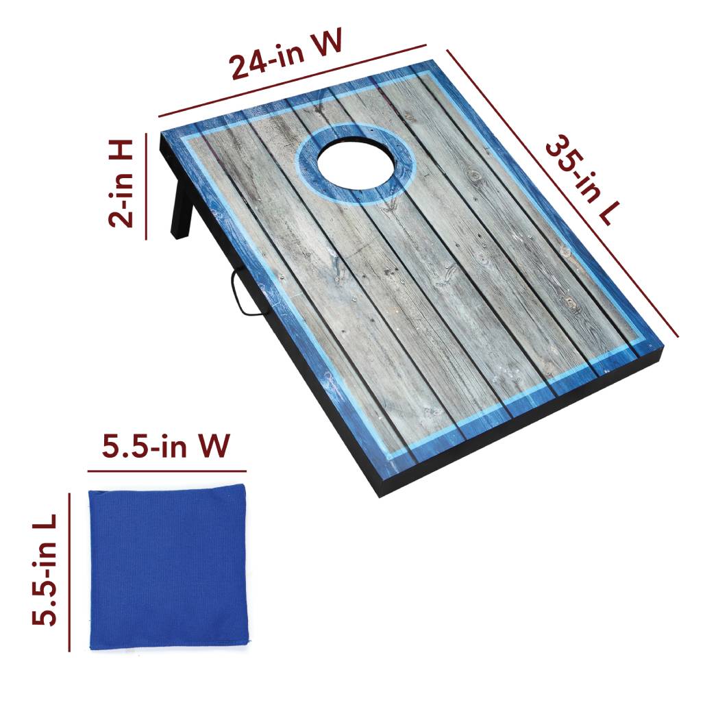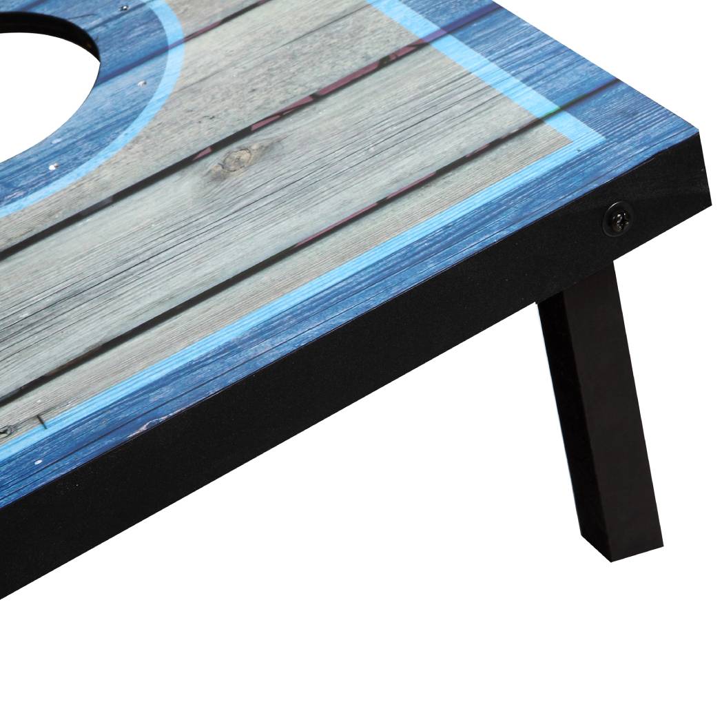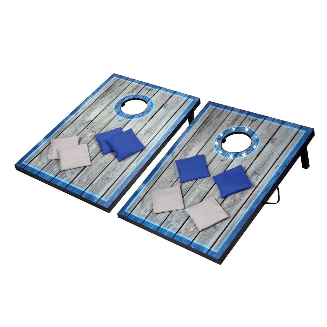 Enjoy classic cornhole at any time of day. This gorgeous set features target areas illuminated by bright, LED lights. The result is a brilliant pair of target boards for nighttime tournaments. This set also looks great in the day, thanks to a contemporary, distressed wood design and stylish blue highlights. Eight, perfectly-weighted bean bags are the ideal size for accurate tosses. Easily take this set on the go, thanks to retractable legs, quick-clasp latches, and convenient carry handles. Bring classic excitement to your next tailgate or outdoor party!