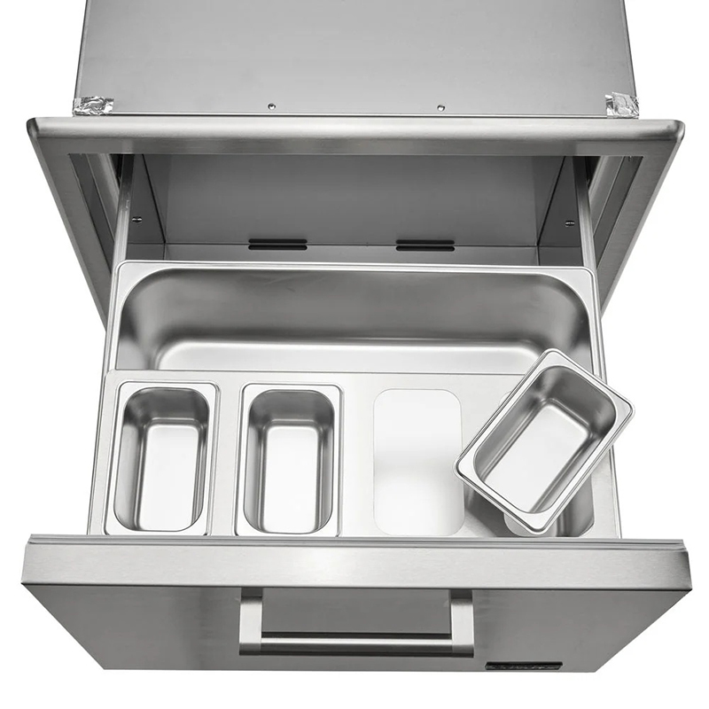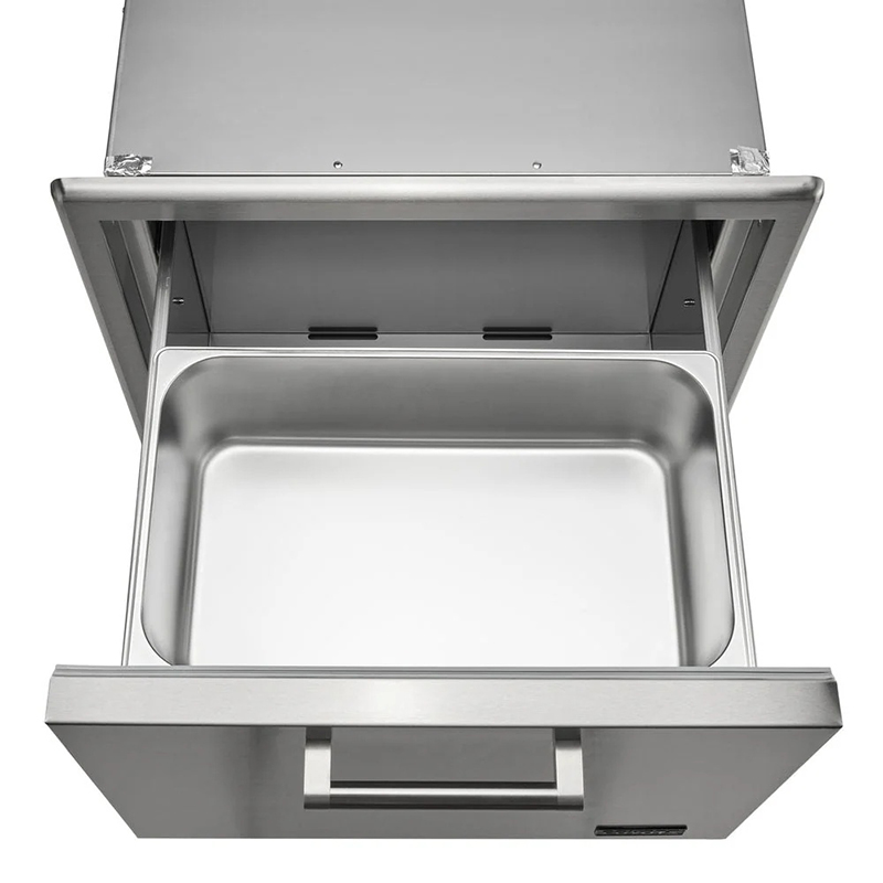 The Coyote 26″ Pull‑Out Ice Chest is a high-end, built-in stainless steel drawer-style cooler designed to keep drinks and ice conveniently accessible while freeing up floor space. With a 3.8 cu ft fully insulated interior and commercial-grade slide-out rails, this unit smoothly extends for easy access to contents. Constructed from premium 304 stainless steel with beveled trim and a sleek handle, it delivers both performance and elegance. Includes a removable condiment tray and drain plug for organization and hassle-free maintenance.