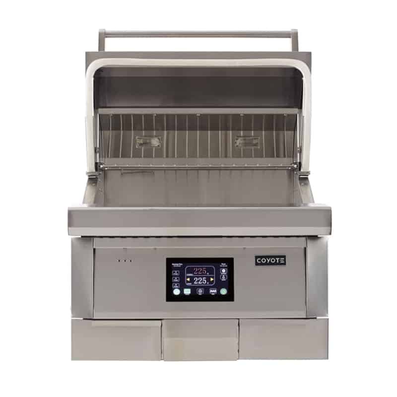 The Coyote 28″ Built-In Pellet Grill combines the rich flavor of wood-fired cooking with the convenience of cutting-edge technology. It is constructed out of 304 stainless steel with a spring-assisted hood. It includes an intuitive digital touch screen control, three food temperature probes, and a range of heat settings that allow you to utilize the grill similar to an indoor oven. The drop pellet system allows you to use any flavor wood pellet, so your flavor options are wide open!