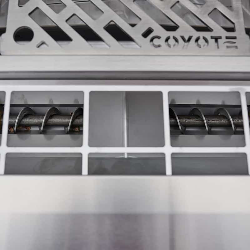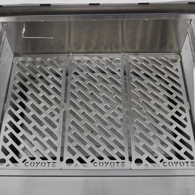 Additionally, the Coyote Versa-Rack system allows you to expand the warming rack for additional cooking surface area. Heavy-duty, laser-cut 304 stainless steel cooking grates provide extra surface contact for great sear marks. This system easily helps you convert the grill from smoking to searing mode with the included interchangeable burn pot grates and removal tool. A dual-fan convection system allows precise temperature control ranging from 175 to 700 degrees Fahrenheit, depending on which burn grate is in use. Three temperature probes are included for easy monitoring of internal food temperatures using the digital control panel. Need to grill at night? Interior grill lighting and an LED temperature probe light allow you to grill in any lighting.