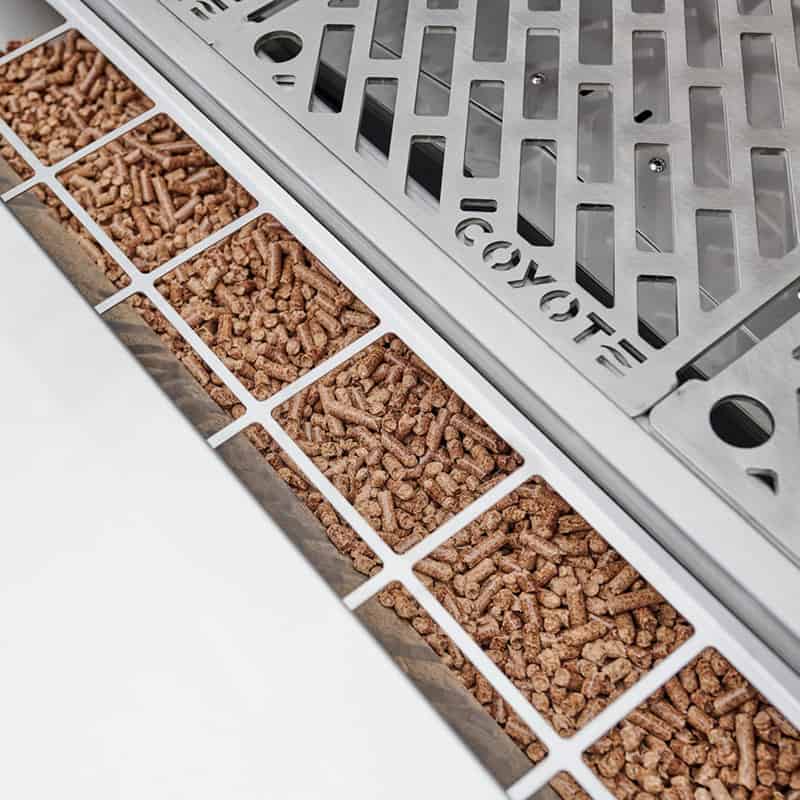 The Coyote’s double-walled hood with gasket keeps heat contained for added efficiency and more consistent grilling temperatures. It also has a built-in spring mechanism for easy opening, and a wind-guard to protect against drafts. The front-loading hopper provides an easier way to add fuel and holds up to 15 lbs. of pellets at a time.