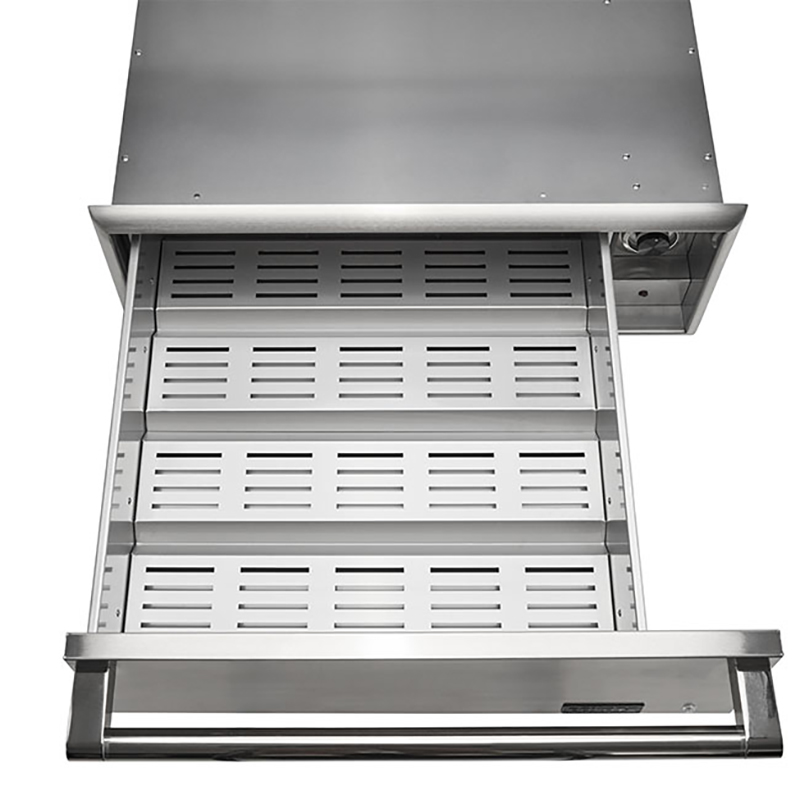 The Coyote 30″ Outdoor Warming Drawer is ETL certified to use outdoors in your BBQ island. The internal electric heating element allows you to keep food warm and ready for serving without overcooking. The drawer features a professional-style door handle and extends on rollers for easy opening and closing. The drawer is constructed with 18 gauge 304-grade stainless steel for long lasting durability.