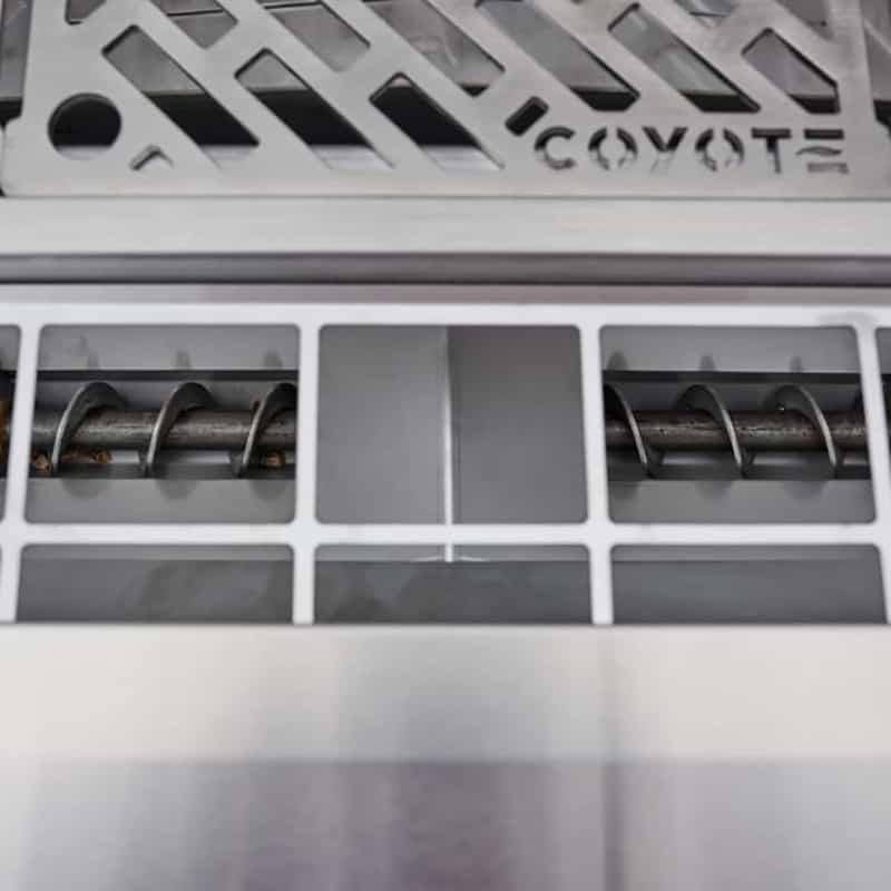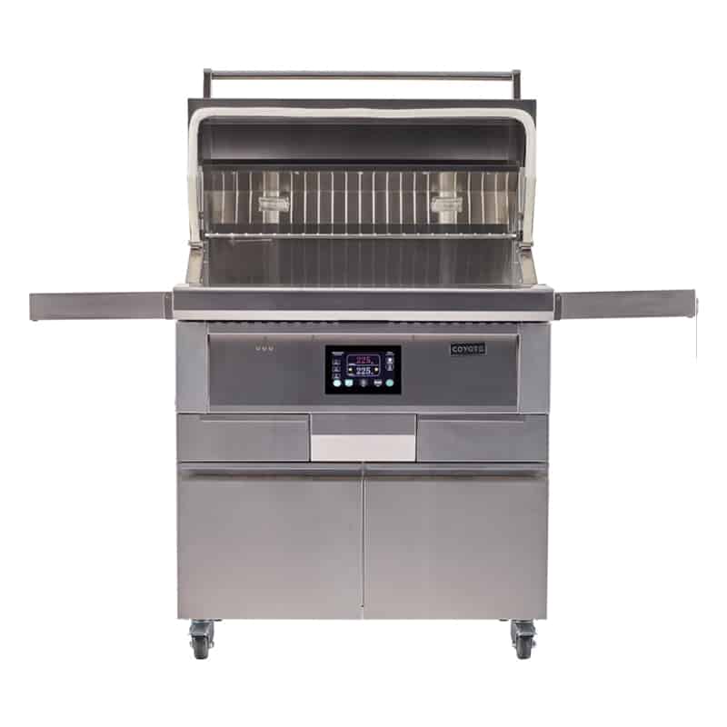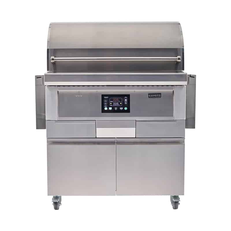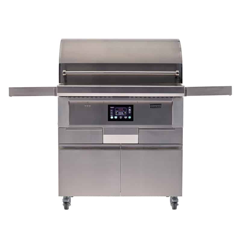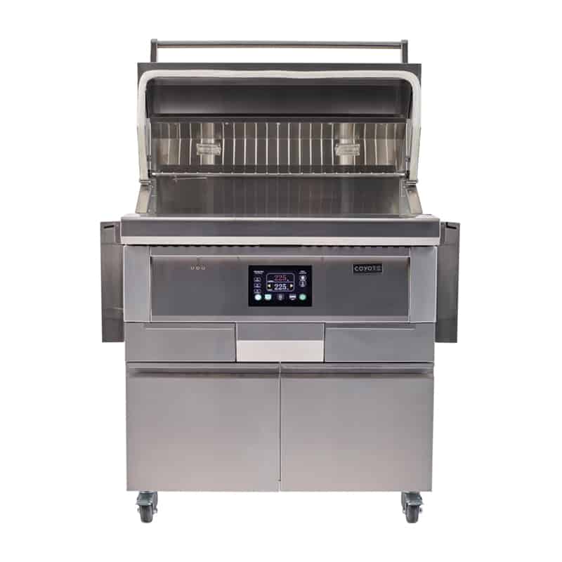 The Coyote 36-Inch Freestanding Pellet Grill is constructed out of 304 stainless steel with a spring-assisted hood. It includes an intuitive digital touch screen control, three food temperature probes, and a range of heat settings that allow you to utilize the grill similar to an indoor oven. The drop pellet system allows you to use any flavor wood pellet, so your flavor options are wide open. The double-walled hood with gasket keeps heat contained for added efficiency and more consistent grilling temperatures, it also has a built-in spring mechanism for easy opening, and a wind-guard to protect against drafts. The front-loading hopper provides an easier way to add fuel and holds up to 15lbs of pellets at a time. The Coyote Smart Drop pellet feed system features dual augers and is compatible with any flavored wood pellets. Heavy-duty, laser-cut 304 stainless steel cooking grates provide extra surface contact for great sear marks. The Coyote Versa-Rack system allows you to expand the warming rack for additional cooking surface area.