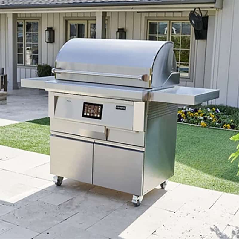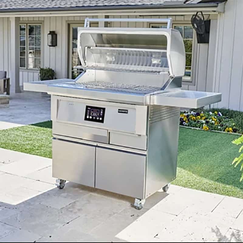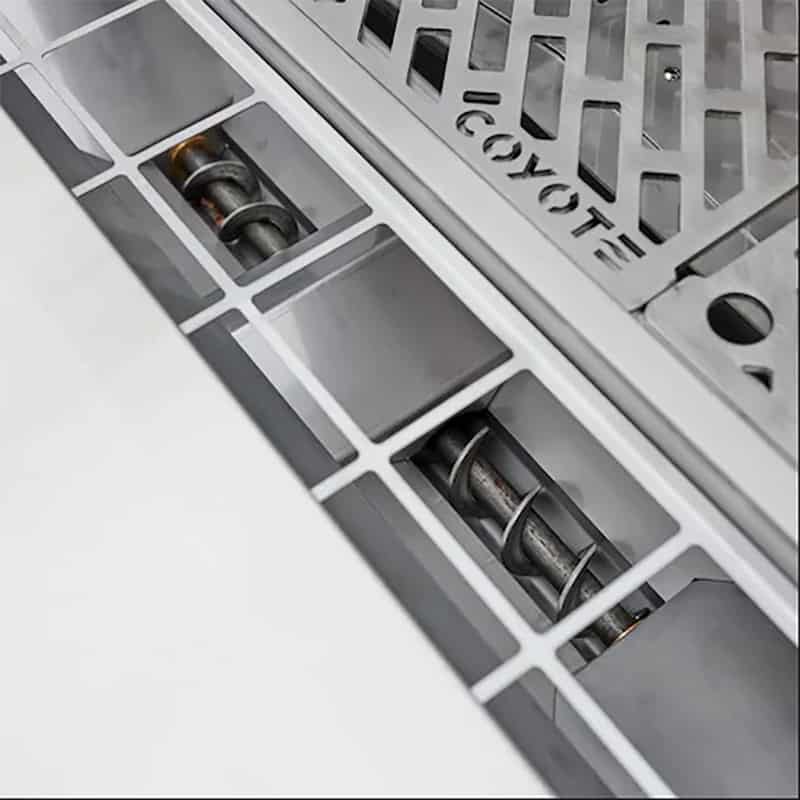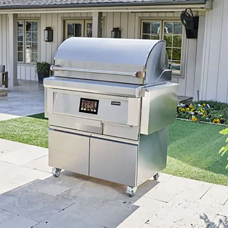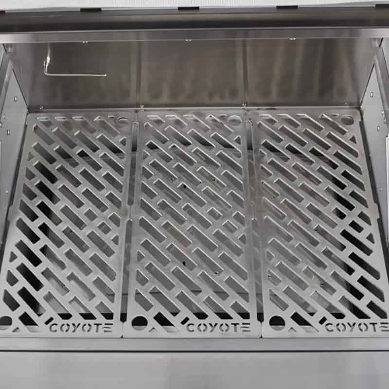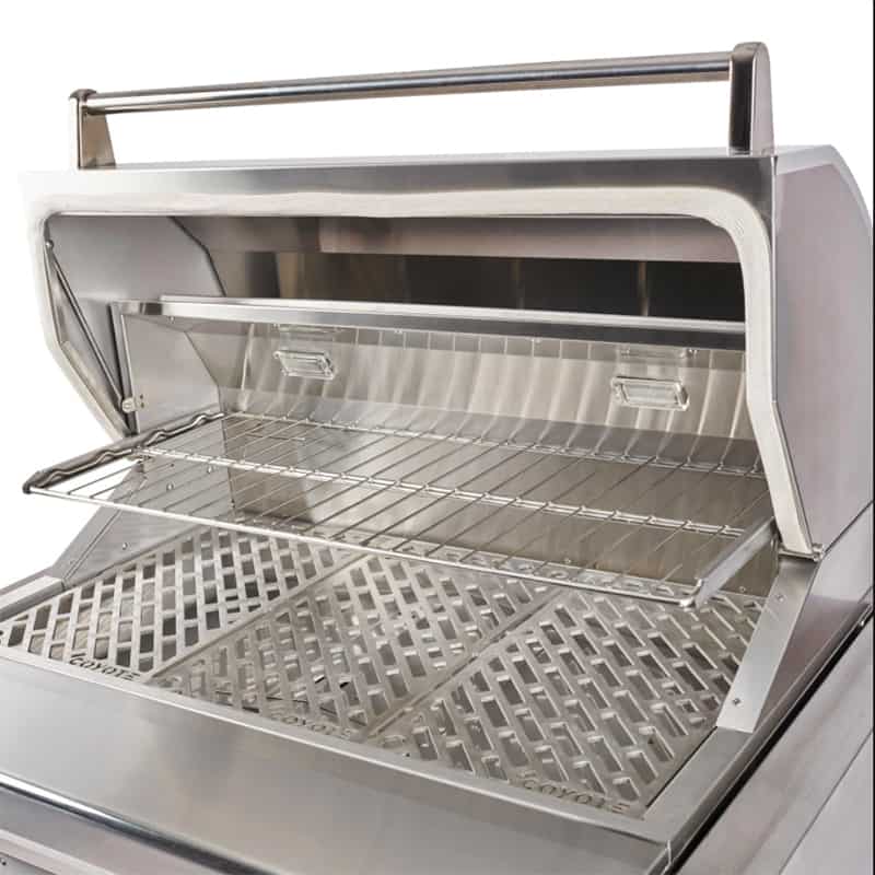The Coyote 36-Inch Freestanding Pellet Grill is constructed out of 304 stainless steel with a spring-assisted hood. It includes an intuitive digital touch screen control, three food temperature probes, and a range of heat settings that allow you to utilize the grill similar to an indoor oven. The drop pellet system allows you to use any flavor wood pellet, so your flavor options are wide open. The double-walled hood with gasket keeps heat contained for added efficiency and more consistent grilling temperatures, it also has a built-in spring mechanism for easy opening, and a wind-guard to protect against drafts. The front-loading hopper provides an easier way to add fuel and holds up to 15lbs of pellets at a time. The Coyote Smart Drop pellet feed system features dual augers and is compatible with any flavored wood pellets. Heavy-duty, laser-cut 304 stainless steel cooking grates provide extra surface contact for great sear marks. The Coyote Versa-Rack system allows you to expand the warming rack for additional cooking surface area.