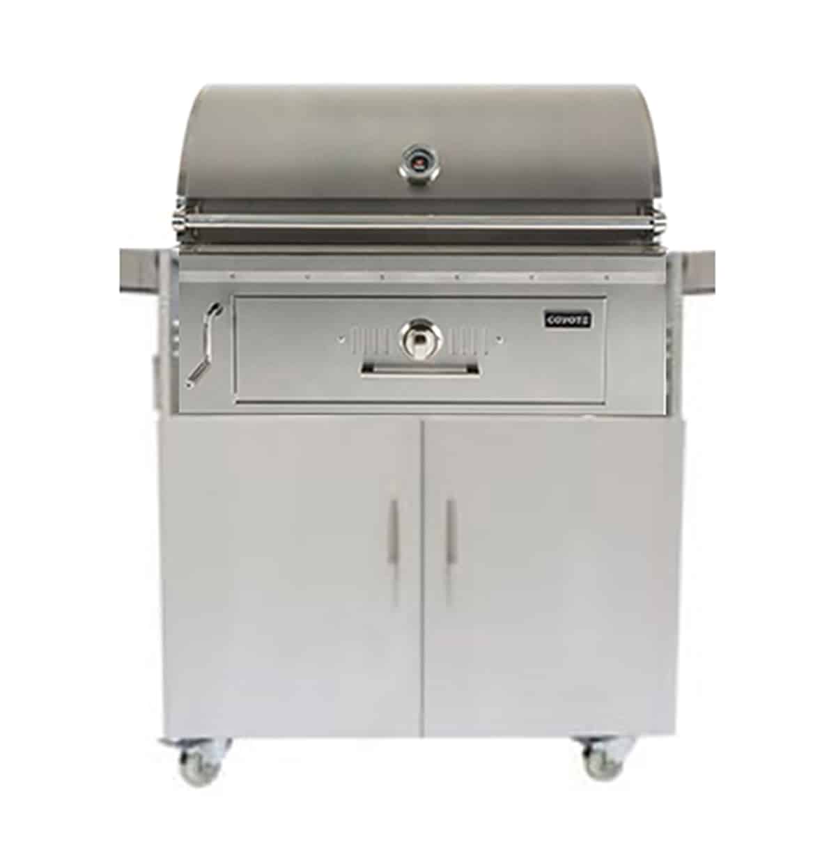- Includes durable, stainless steel cart that holds a 36″ Coyote Charcoal Grill