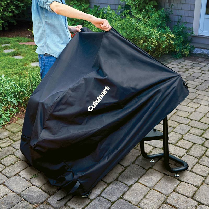 The Cuisinart 28″ Griddle Cover is designed specifically to fit the Cuisinart 28″ Two Burner Gas Griddle. Help protect your griddle from the elements with this heavy-duty, water resistant cover. The cover is designed to fit with the side table attached, so there is no need to remove it after each use. The reinforced corners on the cover help protect from any accidental rips or tears.