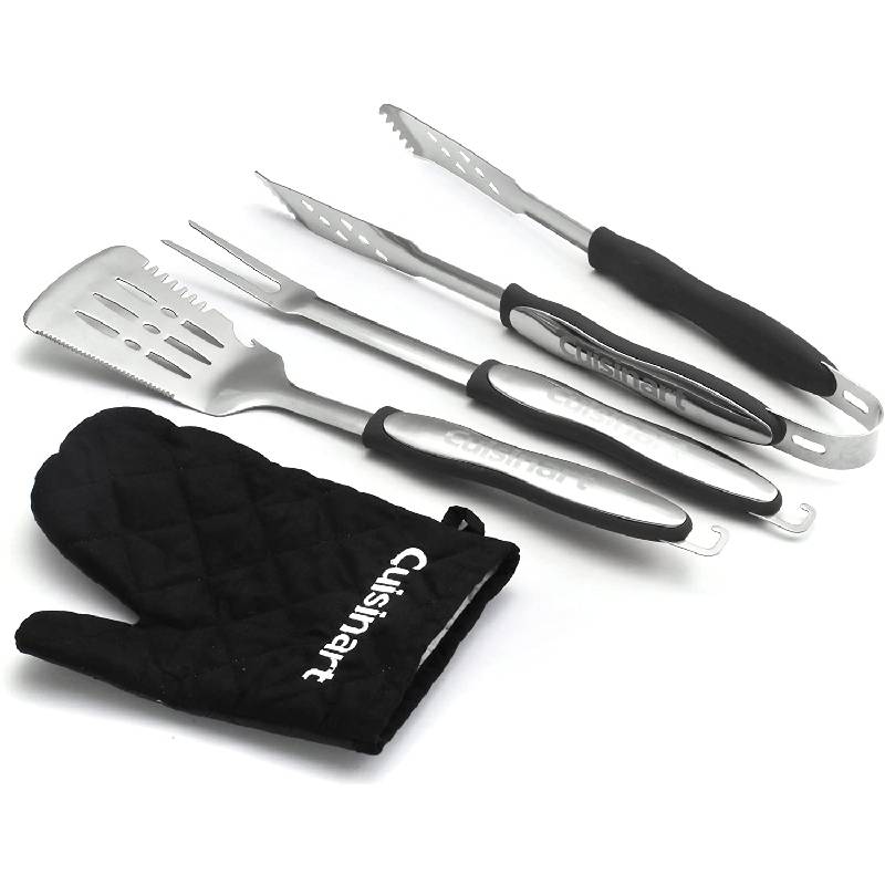 The Cuisinart 3 Piece Grill Tool set includes grill spatula; grill fork; grill tongs; and a bonus grill glove Made of durable stainless steel; integrated loops for hanging Black-accent rubberized plastic grips ensure comfort and a secure grip Elongated handles keep hands safe from the heat.