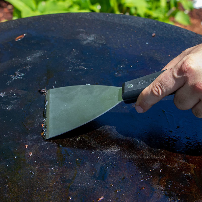 - Flat edge scraper is perfect for breaking up large chunks of food and debris that can get stuck on the griddle surface