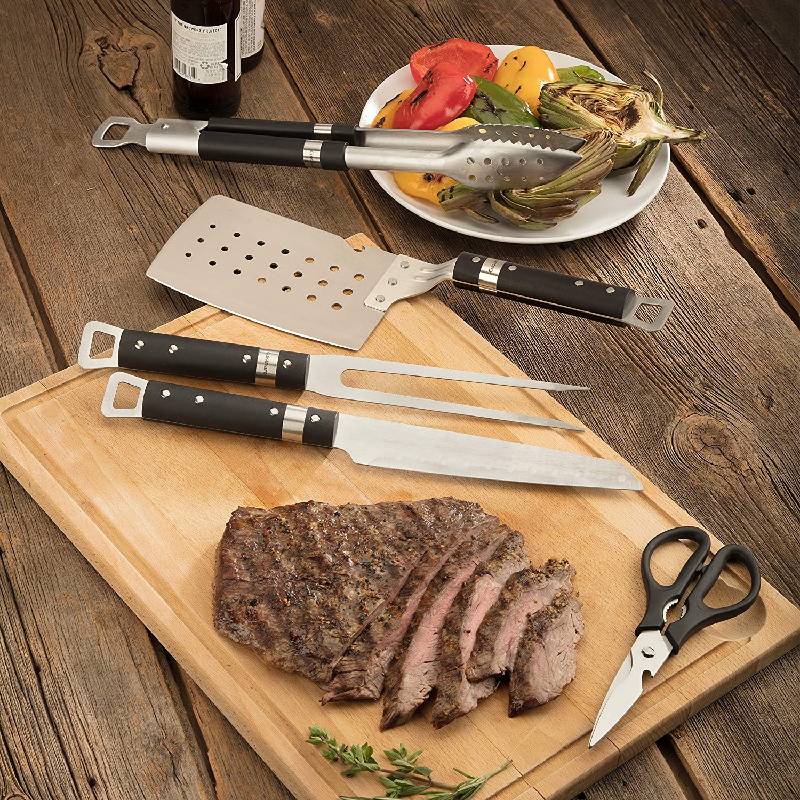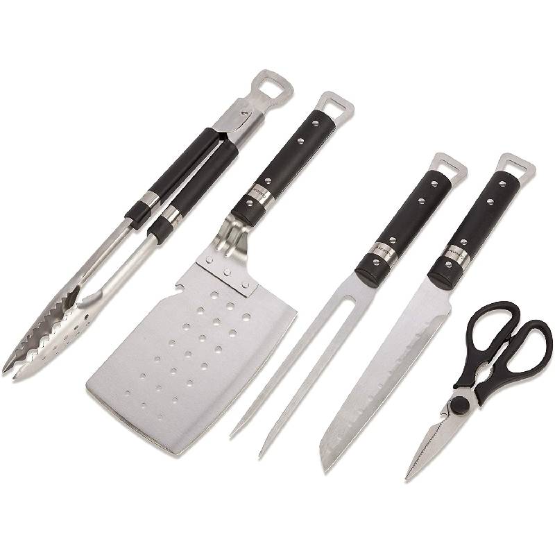 The Cuisinart Chef’s Classic 5 Piece Grill like a Pro with the Cuisinart Chef’s Classic 5 piece grill set! This set includes a spatula, tongs, a carving fork, a butcher knife, and multi-purpose shears. These tools are constructed of professional grade stainless steel with ergonomic plastic handles and integrated hanging loops. The spatula in this set has a large surface, a bottle opener, and a clever cutting edge. The locking tongs feature a precision point grip, perforations for straining, and a scalloped/firm toothed edge.
