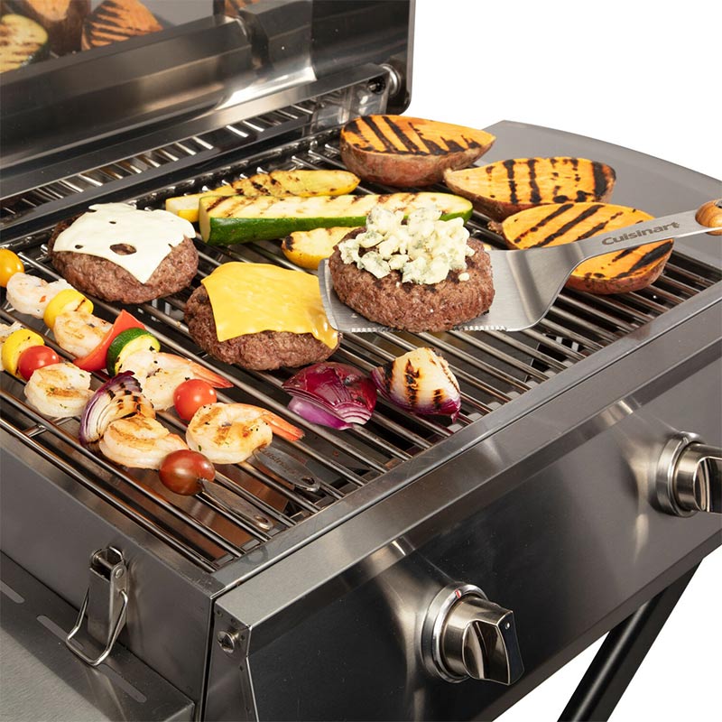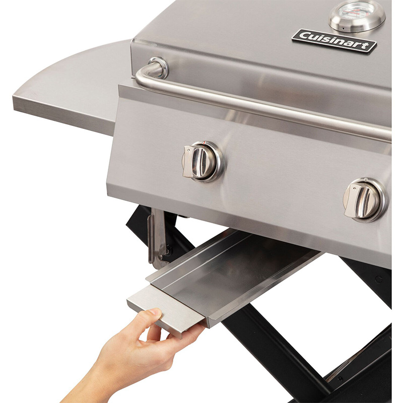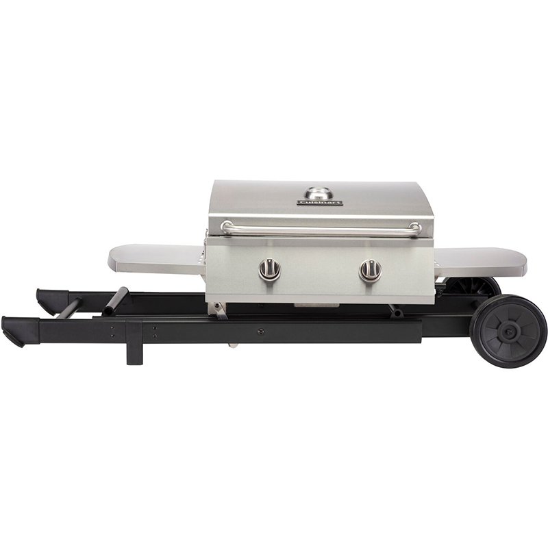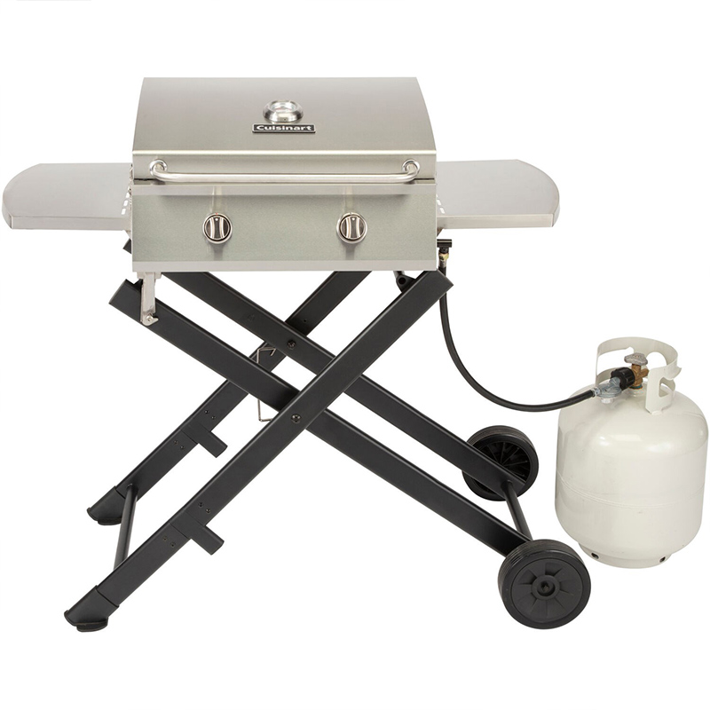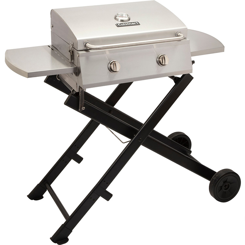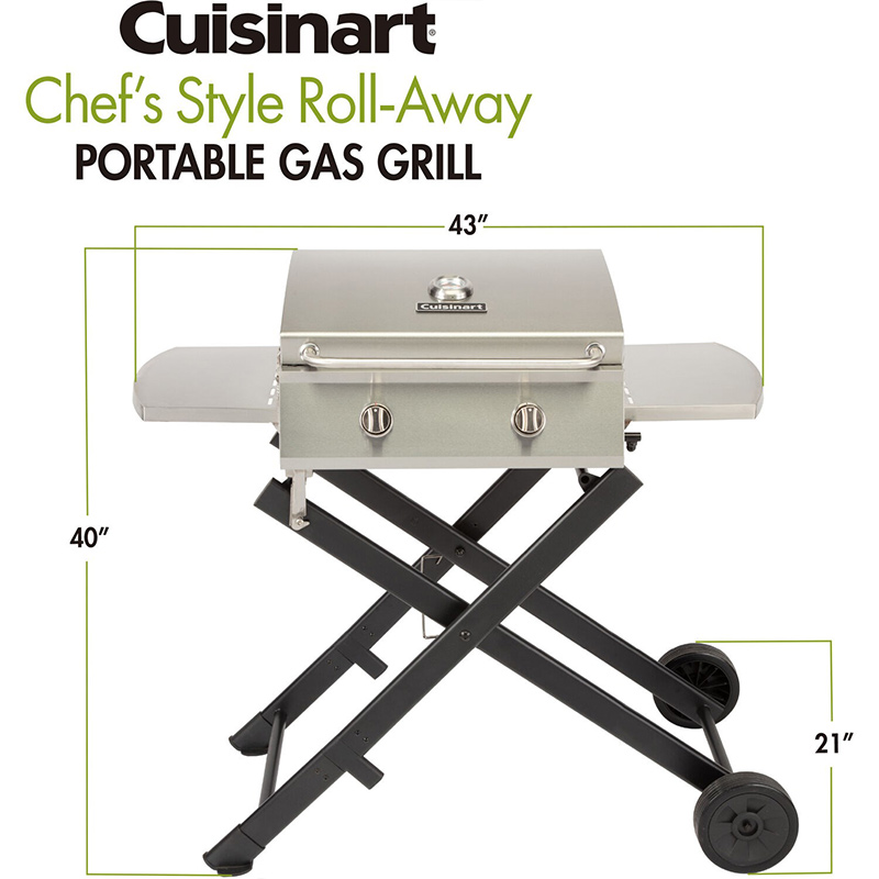 The Cuisinart chef’s style roll-away portable gas grill combines the full size performance with portable convenience! The grill features two stainless steel burners totaling 20,000 BTU’s and a 7mm thick stainless steel cooking grate allowing you to get a sizzling sear on any piece of meat. The cooking grate provides 275 square inches of space, perfect for cooking for up to 10 people. The two side tables offer ample space for prepping and keeping grill tools handy while cooking. The folding x-base design features a spring-assist bar for effortless set up before each use. Two wheels allow the grill to easily be moved around when in the folded position, making it the perfect grill for camping and tailgating trips. The compact folding design allows the grill to easily be stored away when not in use. The all stainless steel grill body helps ensure the grill’s durability and offers a high-end, stylish look that can be featured on your patio all season long!