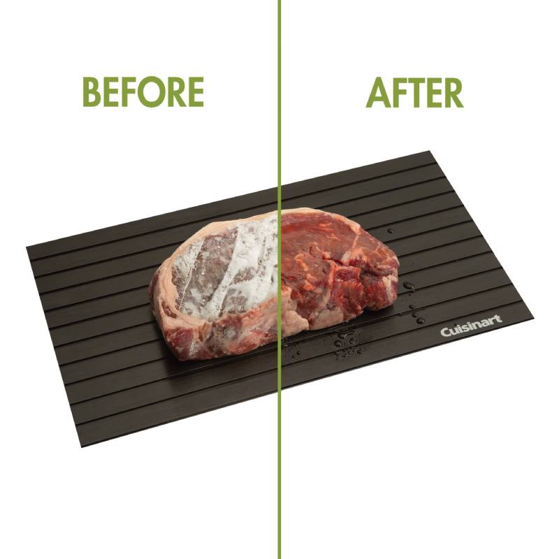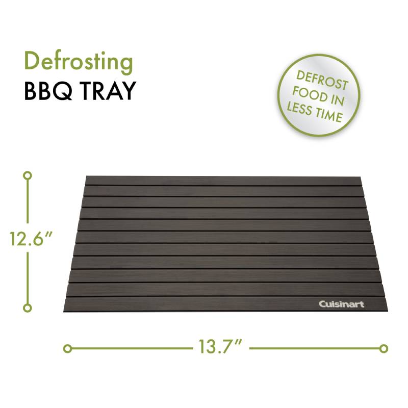 The Cuisinart Fast Meat Defrosting Tray BBQ Defrosting Tray and get back on track. This tray quickly thaws chicken breasts, steak, pork chops, lamb chops, vegetables, and more in less than half the time! The aluminum material is lightweight and easy to use, place the frozen meat or vegetables on the tray and watch as it defrosts it right before your eyes! It is made with a high thermal conductive material that quickly and naturally transfer warmth evenly across the surface of your food. The Cuisinart BBQ Defrosting Tray will be one of those products that you’ll tell your family and friends about!