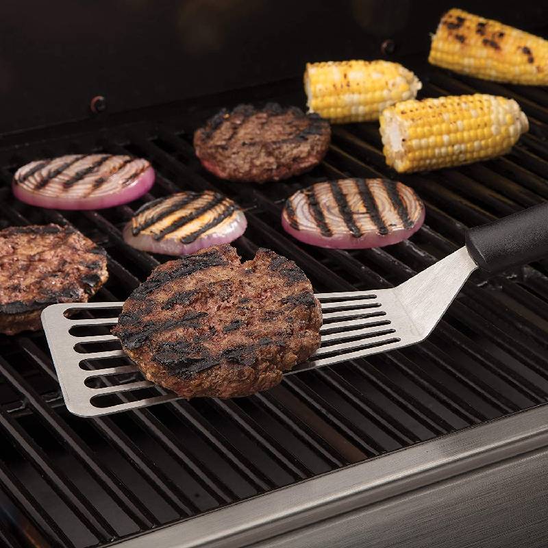 The Cuisinart Flexible Slotted BBQ Spatula is perfect for lifting, turning, flipping, frying, grilling, baking, and more! The beveled edge helps slide beneath foods, while the slots in the head allow grease, oils, or sauces to drip through. This multipurpose firm-flex spatula is flexible enough to lift delicate food and strong enough to lift a heavy burger patty.
