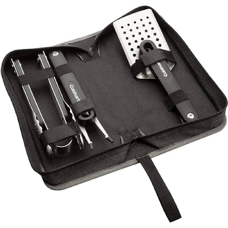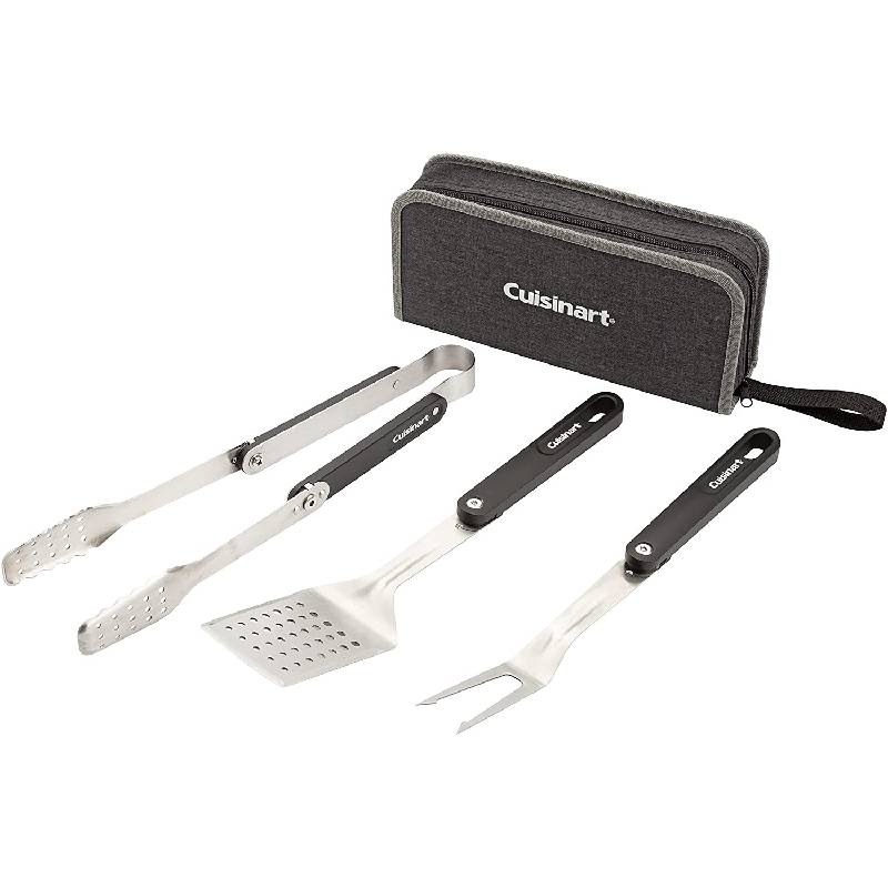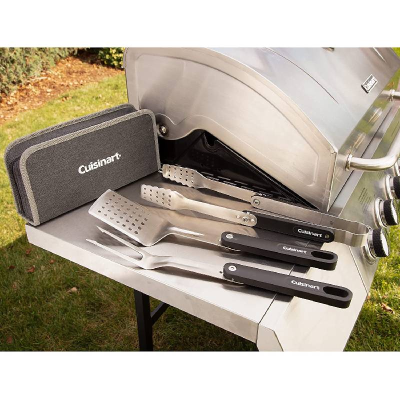 The Cuisinart Folding Toolset with Bag combines the safety of full-sized wood handled grilling tools with the storage convenience of a kitchen utensil. At their full 17 inch length, the stainless steel spatula, fork, and grill brush can handle all the foods on your grill without having to reach your hand over the flames. When the grilling is over, the Pakka wood handle tools conveniently folds down to 11.5 inches.