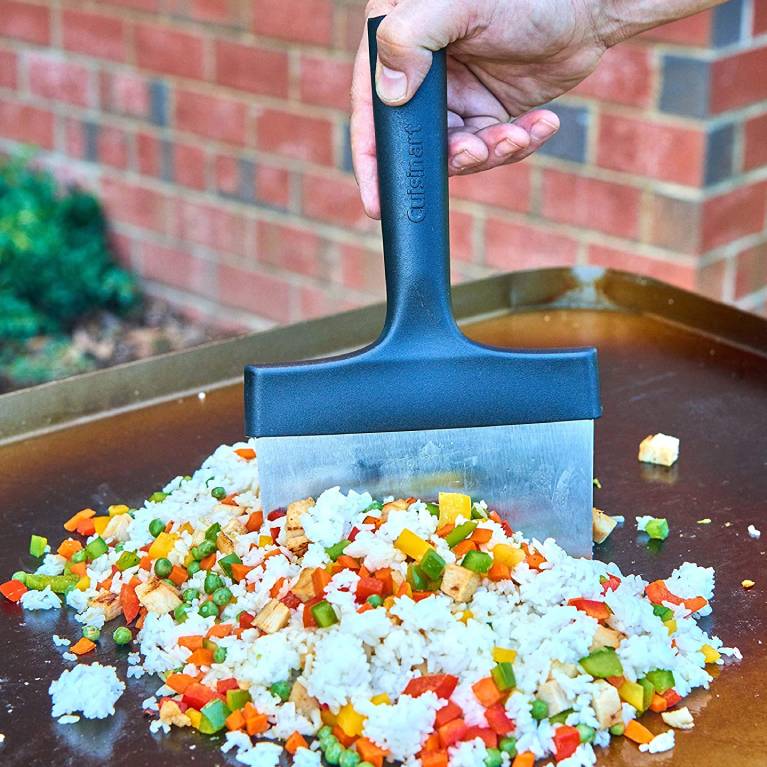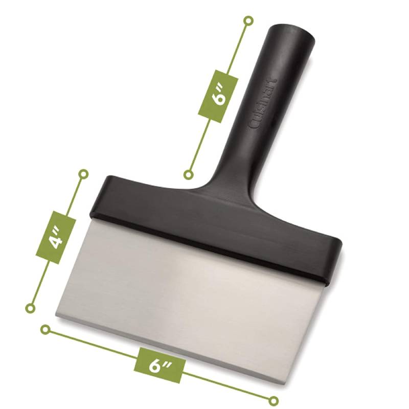 The Cuisinart Multi-Purpose Tool Scrape, Chop, and Serve with the Cuisinart Stainless Steel Griddle Scraper. This scraper has a 6” stainless steel blade that is perfect for chopping and dicing food into smaller portions while still on the hot griddle. Once finished cooking, this scraper will easily removes burnt, caked-on residue, leaving you with a clean griddle.