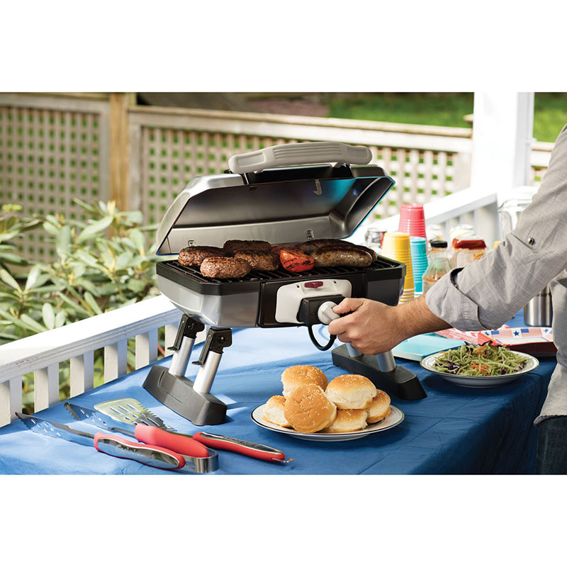 - 1500-watt tabletop electric grill approved for outdoor use