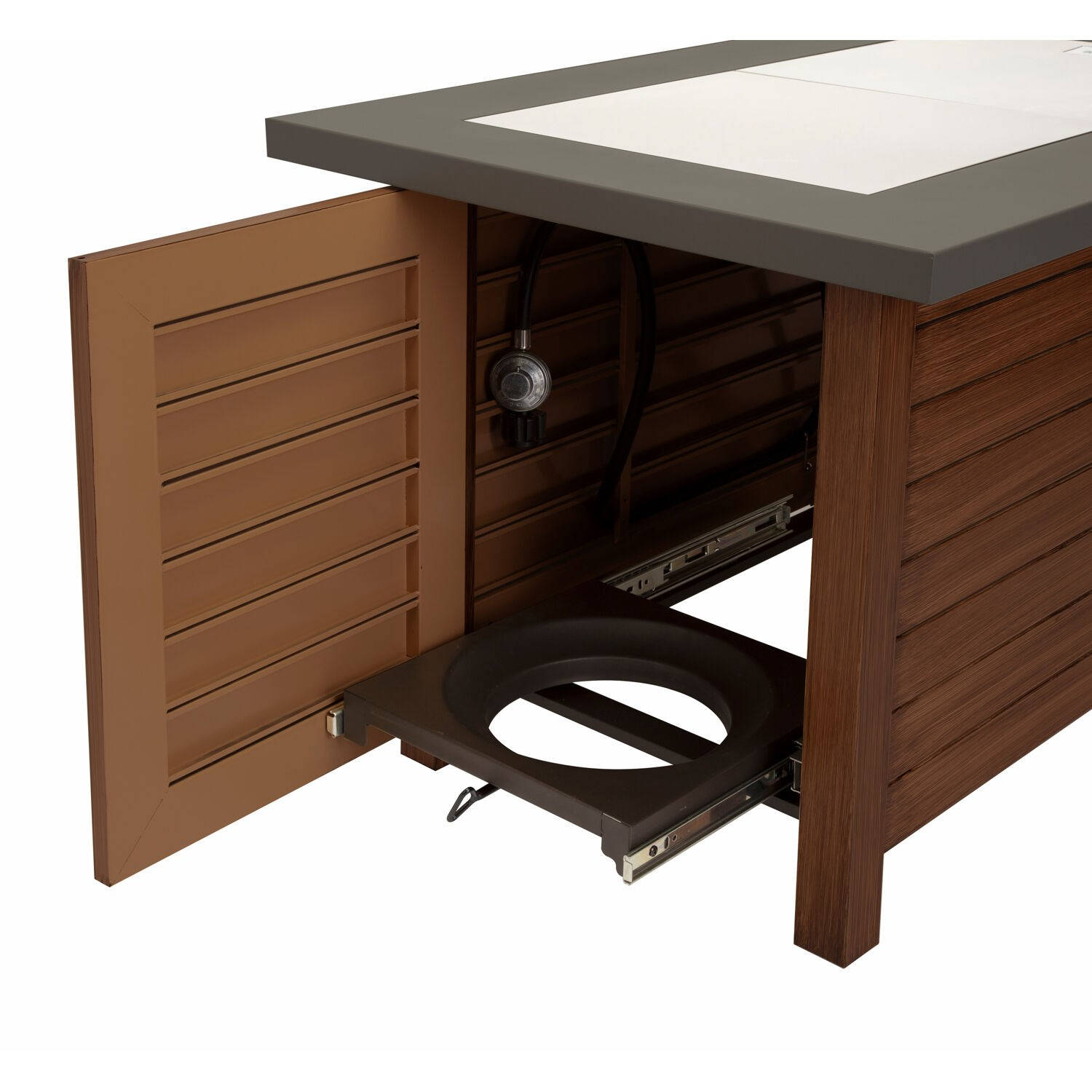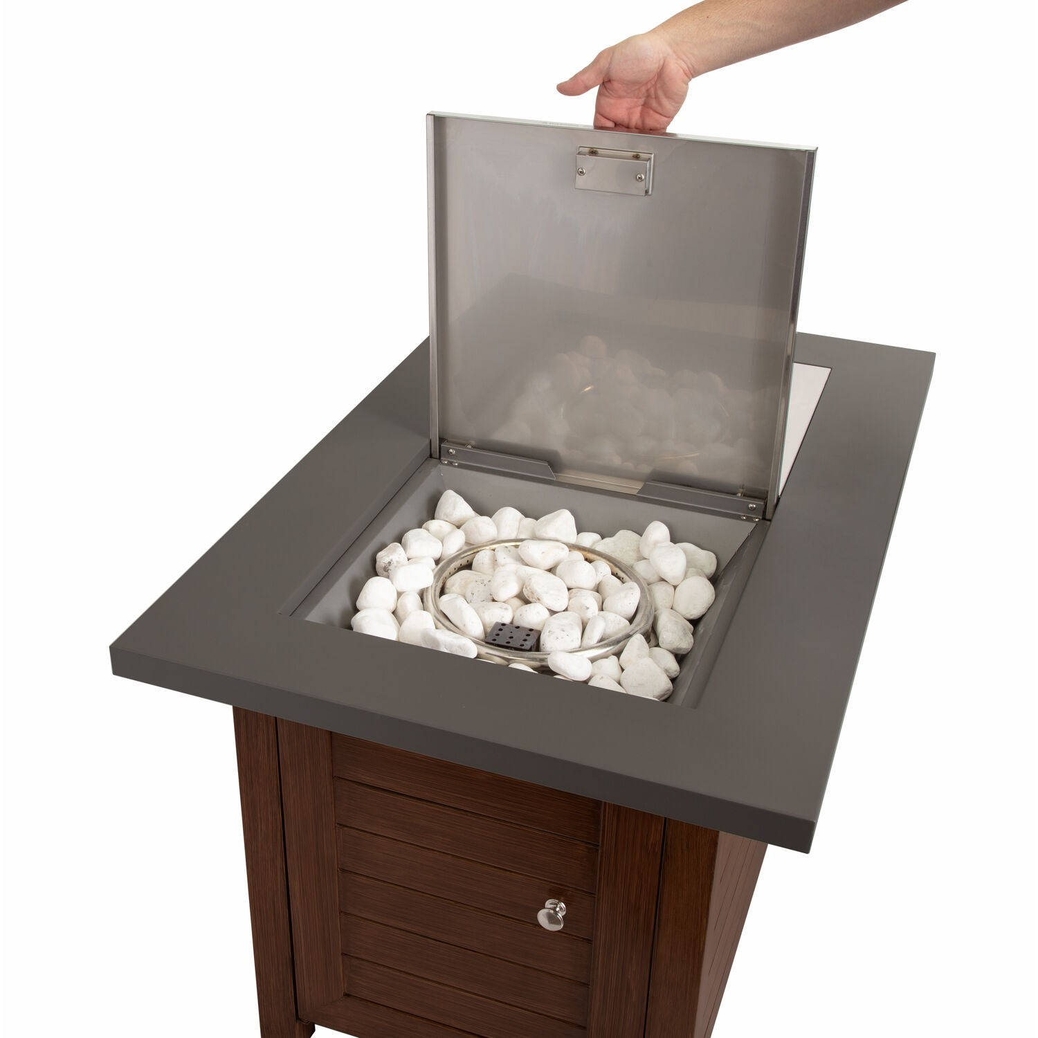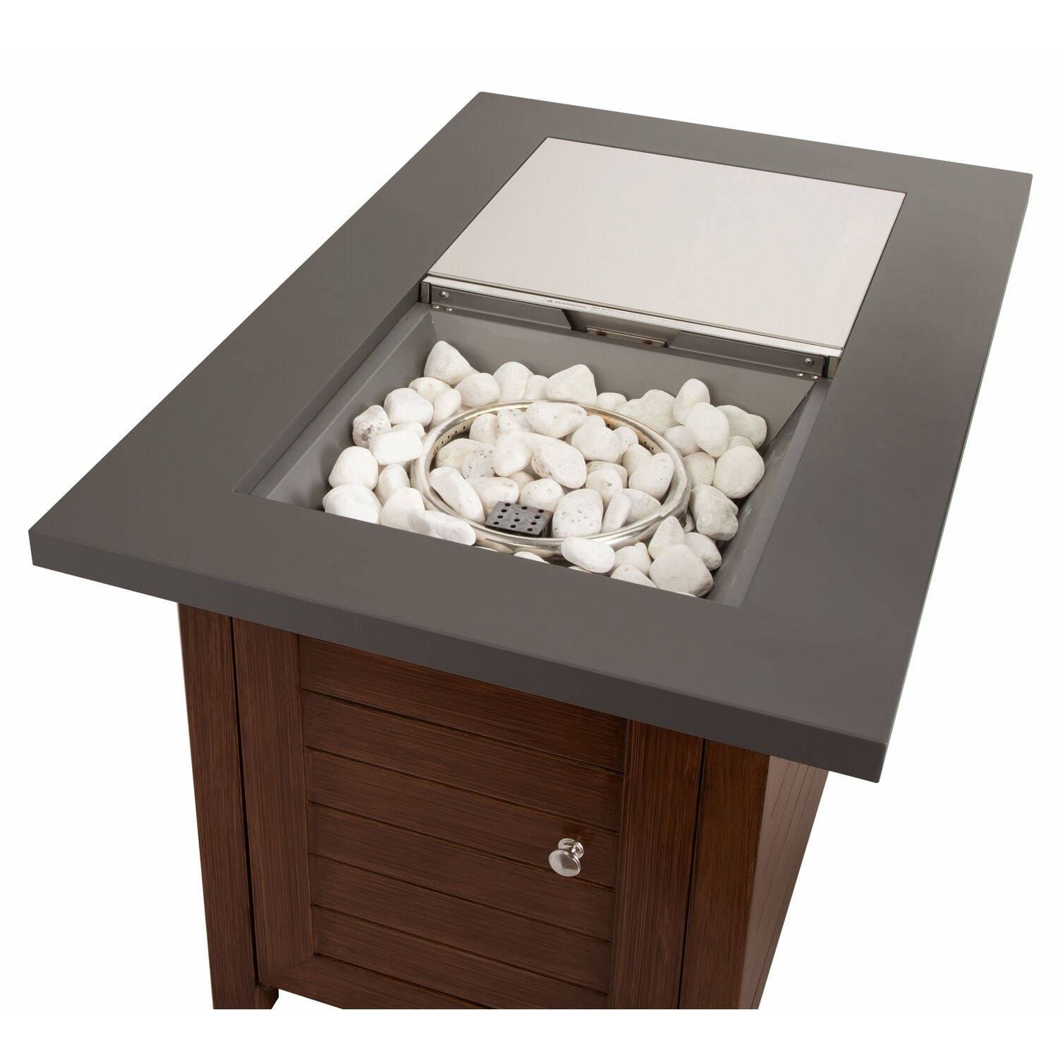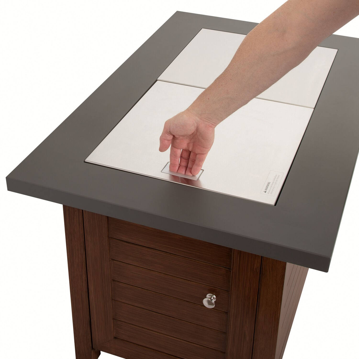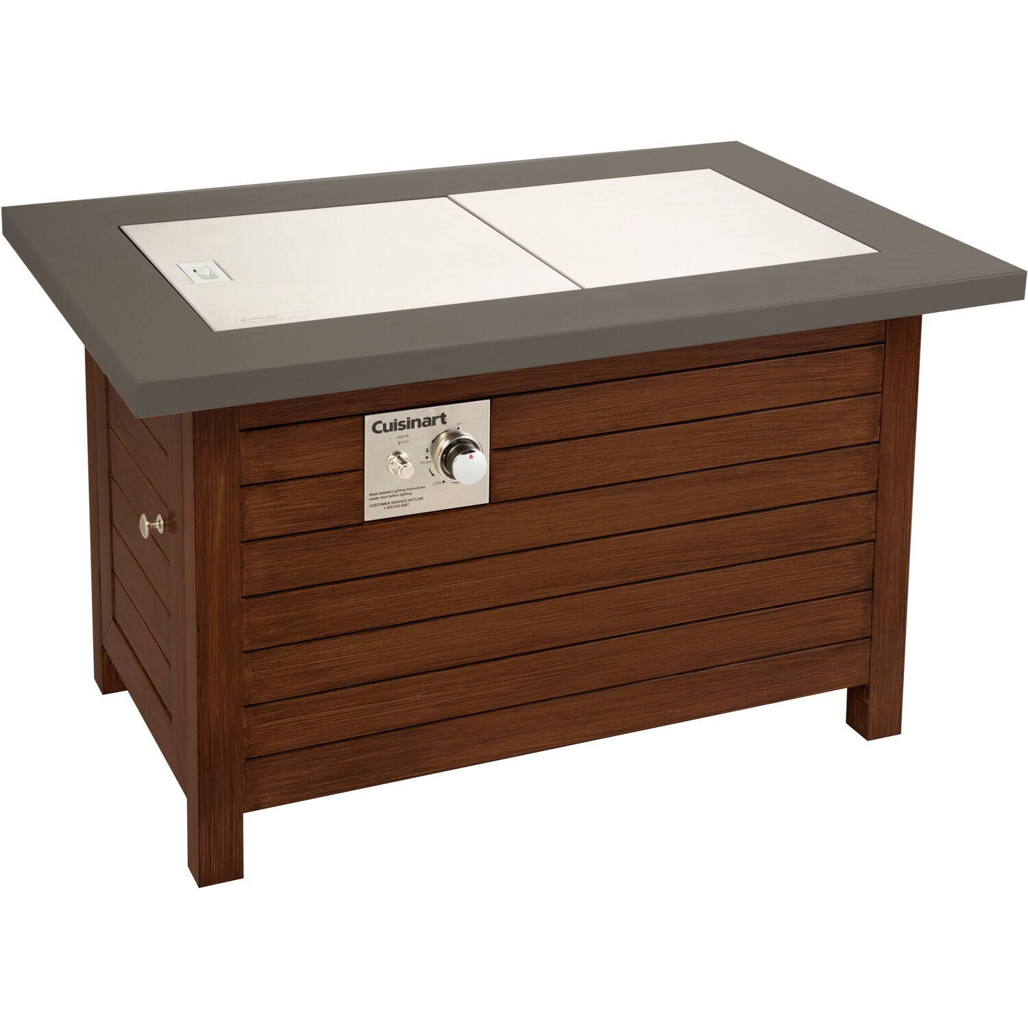Gather your friends and family around the Cuisinart fire pit table, this stylish fire pit will create an intimate atmosphere in your outdoor living space. This fire pit uses propane gas to support clean burning with a smokeless experience. The 20lb propane tank, not included, stores conveniently inside the table, hiding it from plain sight. The heat output is 40,000 BTU’s providing ample warmth for those chilly nights. The body of the fire pit is made with very modern woodgrain metal panels that give the look of actual wood, while providing a durable heat resistant base to the table. While not in use, an integrated cover slides over the fire pit and transforms it into a multi-use coffee table. Relax while watching the flames on the Cuisinart fire pit table dance in the dark, creating an escape from your own backyard.
