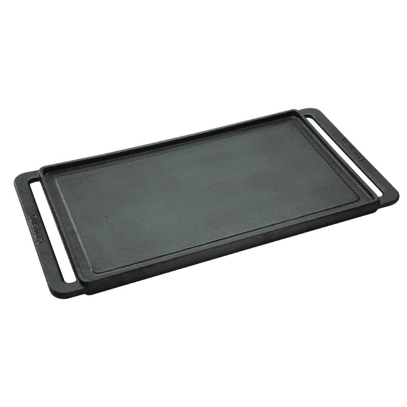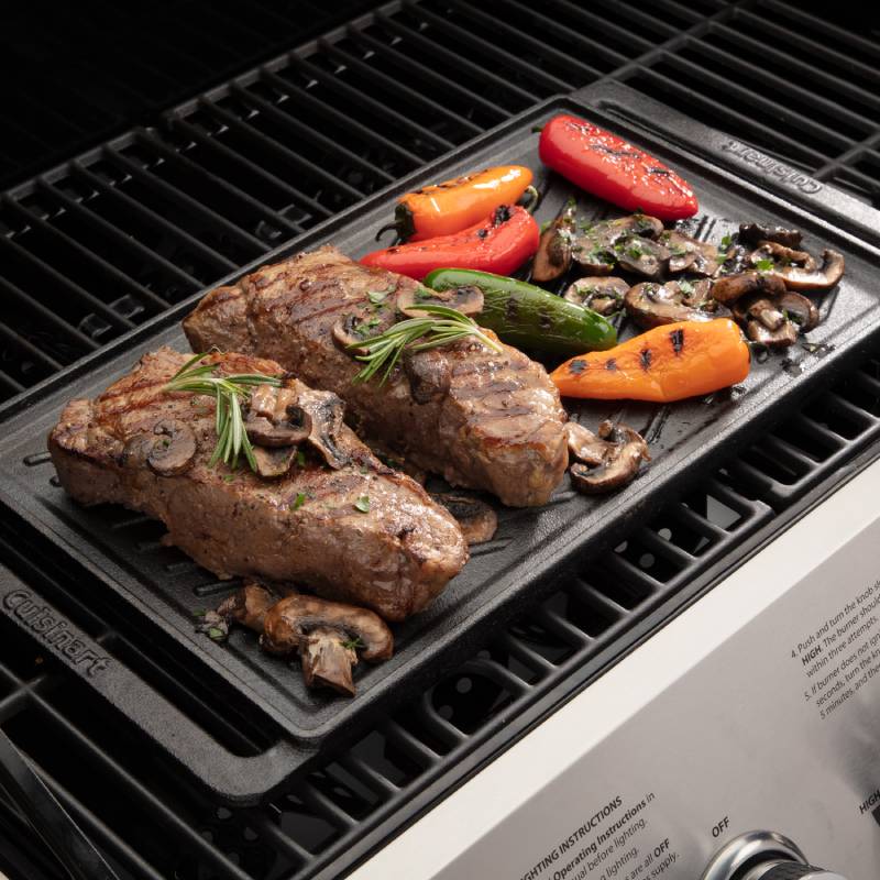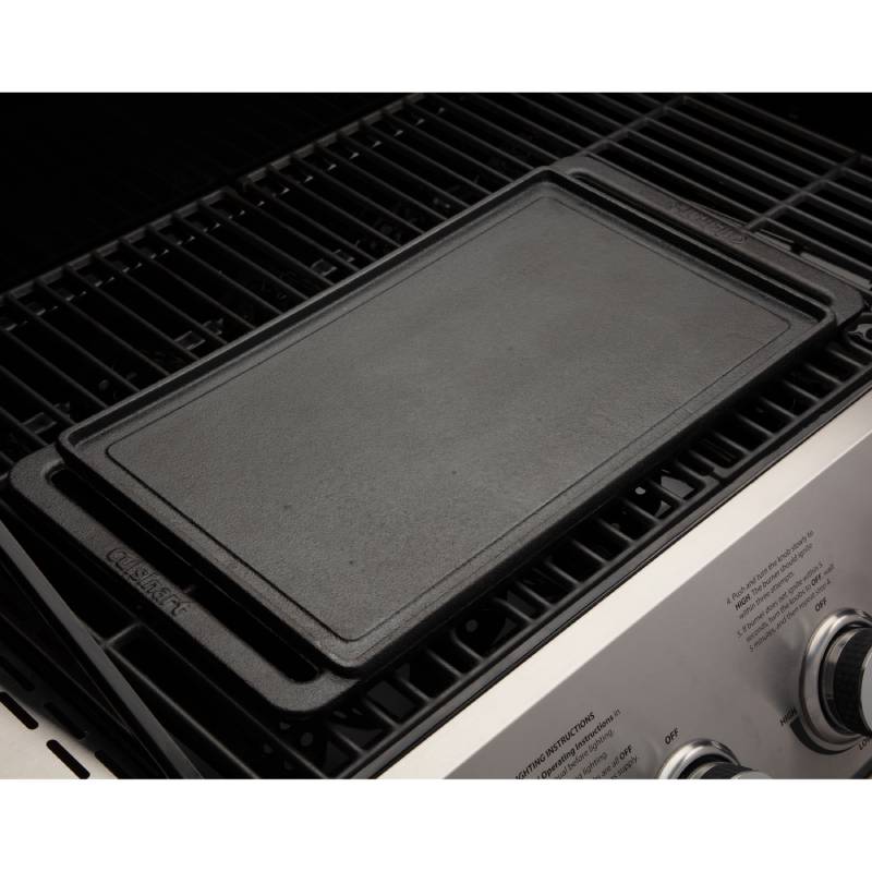 The Cuisinart Reversible Cast Iron Griddle Plate is a heavy duty, cast iron plate. It features a ribbed grill on one side and a smooth flat top on the other. Use the griddle side to cook up some bacon and eggs in the morning, paninis in the afternoon, and flip it over to sear steaks for dinner. The cast iron construction provides maximum heat retention with even heating across the surface. The plate fits perfectly on your grill to sear more delicate foods like fish and veggies and can also be used indoors on your stove top over 2 burners.