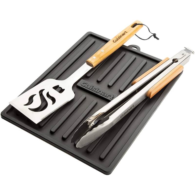 The Cuisinart Silicone Grill Tool Mat can Protect your grill side tables from stains and scratches. Place your used and dirty grill tools on the mat and the raised edges keep grease and grime on the mat and off of your grill. The durable silicone material grips firmly to your side table and wont move or slide during use. The 11″ x 14″ mat fits almost all grill side tables and is top rack dishwasher safe. This is an essential tool for any level griller to help keep your clean looking clean and new!