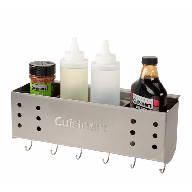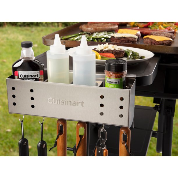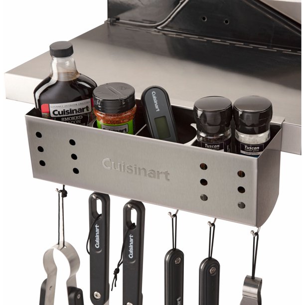 The Cuisinart SS Grill Caddy will help clean up your side table of any clutter, while keeping necessary tools close by. No need to drill into your side table, the compatible clamp system make the assembly process super easy and will fit on most side tables of grills and griddles! This caddy also comes with a removable condiment holder (great for squeeze bottles) and 3 C-hooks that will hold 6 tools.