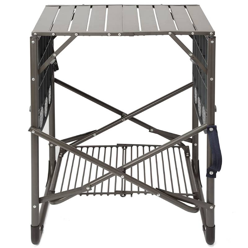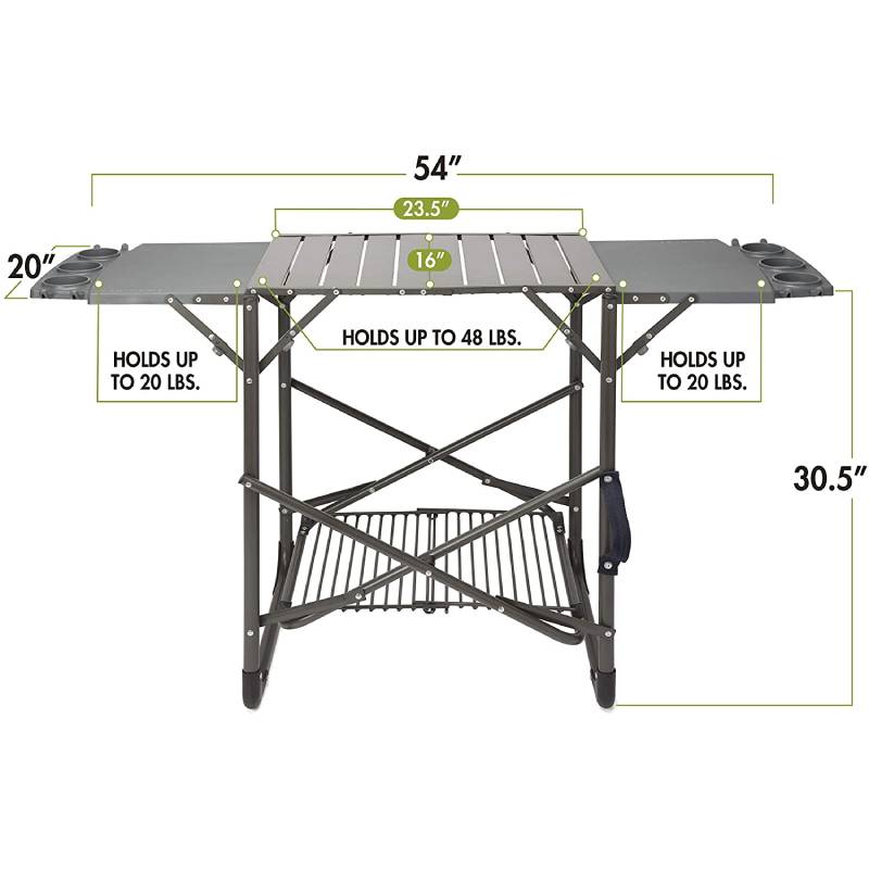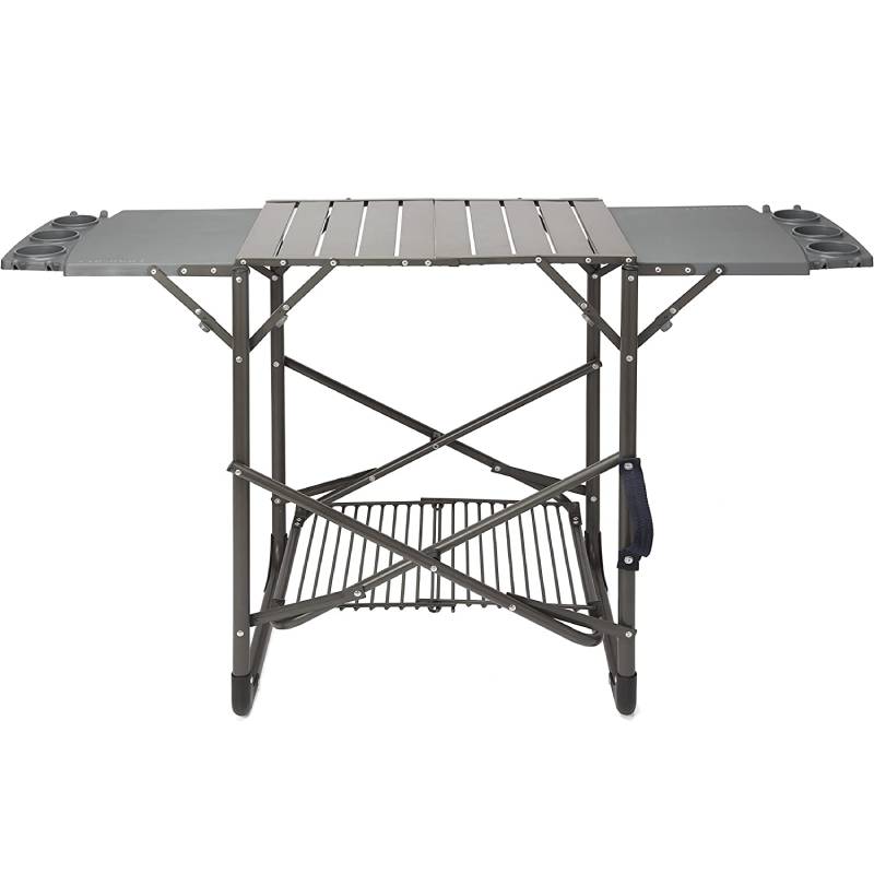 The Cuisinart Take Along Grill Stand take along grill stand folds flat & comes with a carrying strap, making it easy to bring along to your next cookout adventure! Unfolds in less than a minute, has two side trays with six cup holders and eight hooks for your grilling tools! The storage shelf keeps your cooler nearby and out of the way. This portable grill stand keeps your Cuisinart grill at the perfect height for cooking.