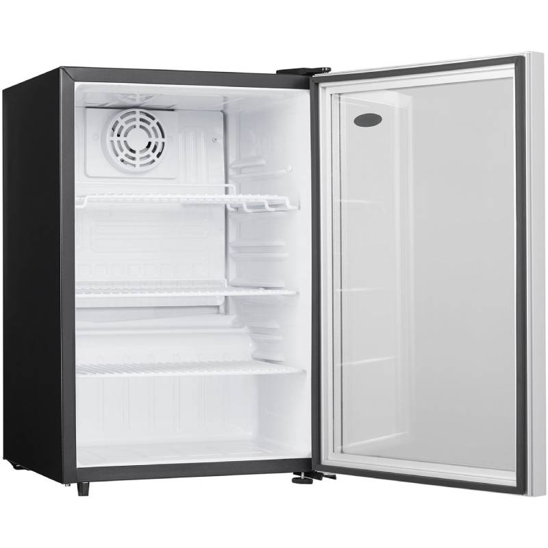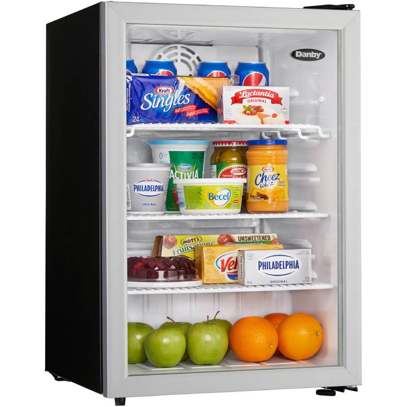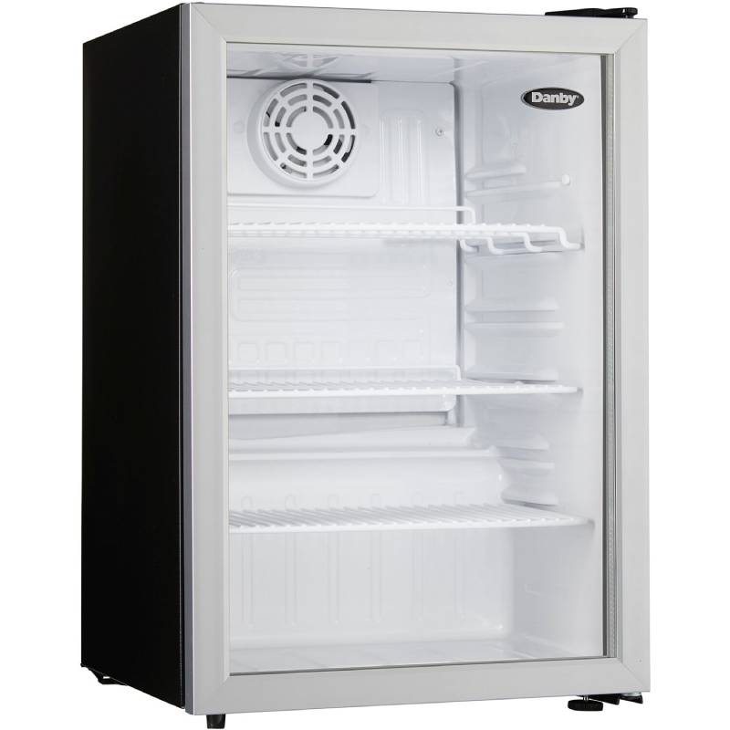 This commercial-grade Danby 2.6 cu. ft. compact all-refrigerator features an elegant see-through glass door design with a stainless steel-look trim. Its ample storage space, interior LED light, and commercial-grade energy rating makes it the perfect addition for your guests.