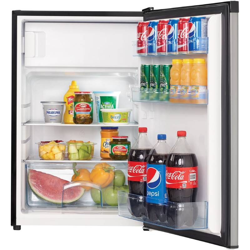 Danby 4.5 cu. ft. Single-Door Compact Refrigerator with True Freezer in Stainless Steel. This compact refrigerator by Danby offers 4.5 cubic feet capacity with a sleek stainless steel finish. It includes a full-width true freezer section (operates at -18°C) to ensure your ice cream and perishables are kept frozen and comes Energy Star rated. The reversible door and smooth-back design will allow this unit to fit neatly against a wall or in a corner.