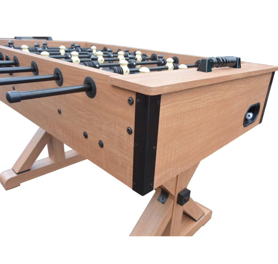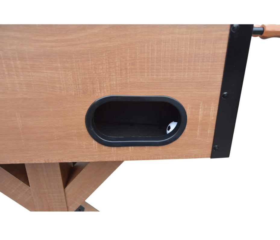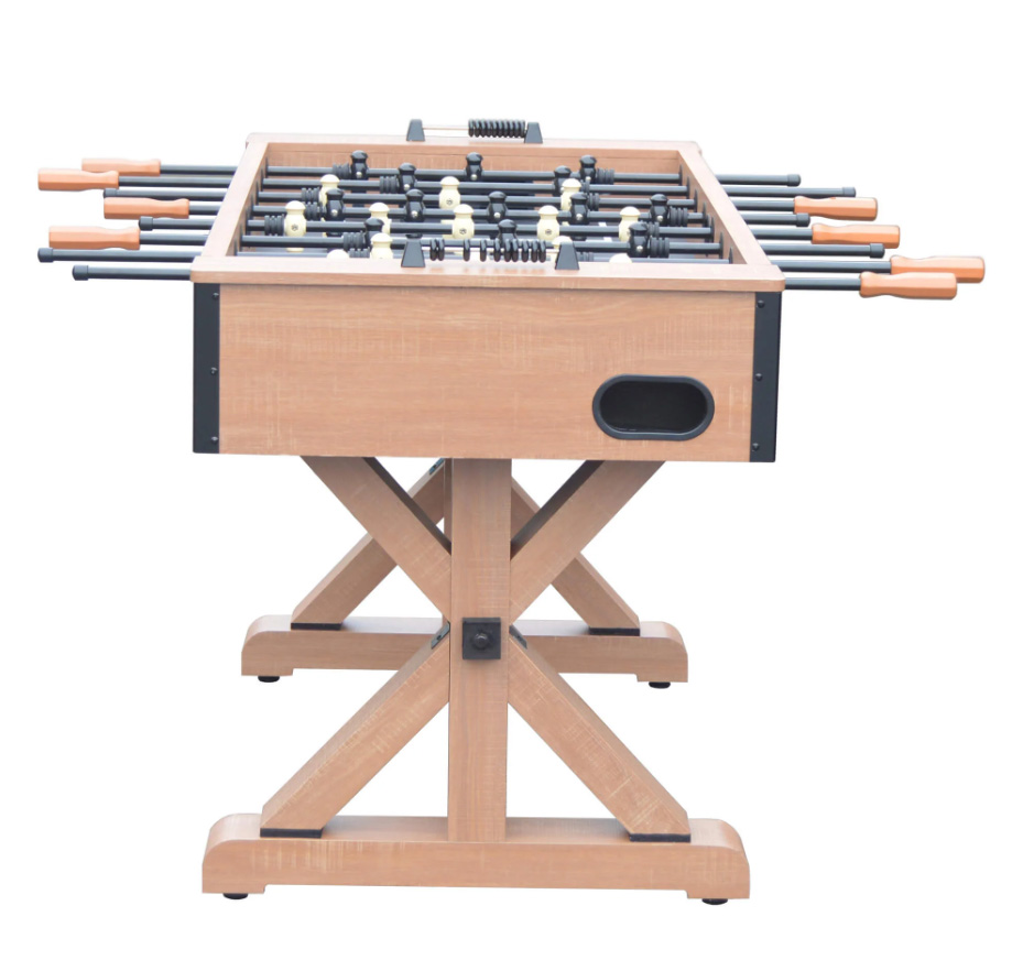 The Daulton 55-Inch Foosball Table combines rustic charm with durable construction, making it a standout addition to any game room. Crafted from sturdy engineered wood and finished in urban oak melamine, it showcases the character of reclaimed wood while ensuring long-lasting performance. The table features a sleek black playing surface, counterbalanced ABS players, and 5/8-inch black steel rods equipped with E-Z spin bearings for smooth, responsive gameplay. Its trestle-style support base with a crossbeam and hidden leg levelers provides exceptional stability, even during intense matches.