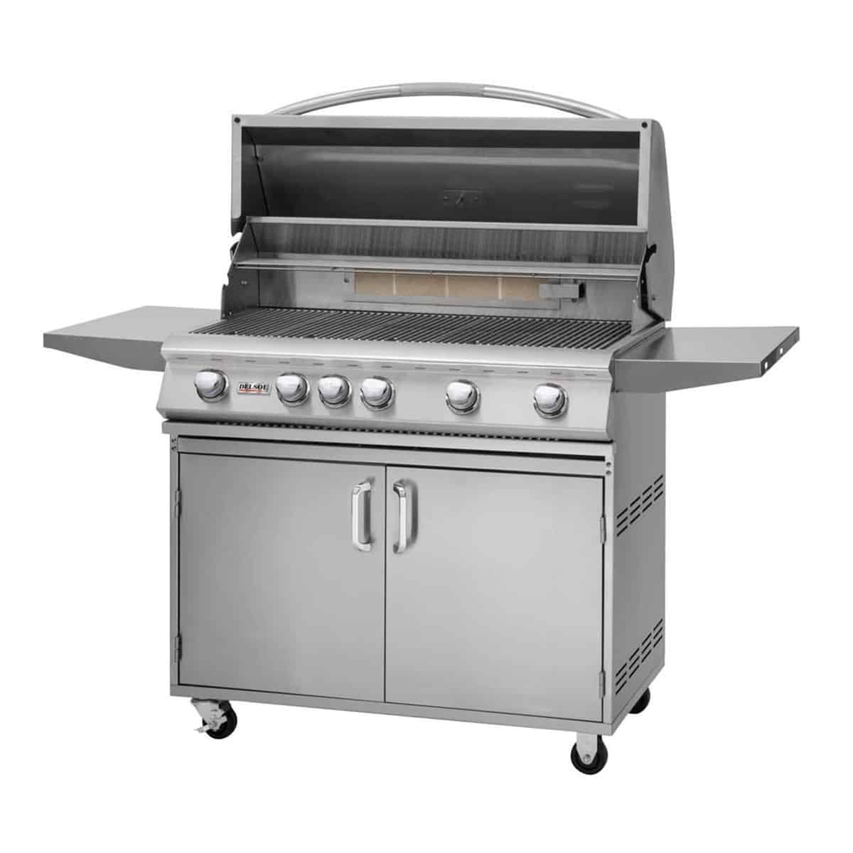The Delsol Delta 40-Inch 5-Burner Freestanding Gas Grill combines a convenient grill size with high-end performance. This grill features (5) 18-gauge 304 stainless steel burners and a 675-square-inch grilling surface. For added performance, this grill features an integrated rear infrared rotisserie burner. Each Delsol grill combines direct heat and ceramic radiant grilling for hotter grilling temperatures and even heat distribution. This innovative design eliminates hot and cold spots within the grill for consistent cooking results across the grill surface. This unit offers high-performance BBQ grilling perfect for professional cooks and weekend grilling enthusiasts alike. For added reliability, this grill features a Push & Turn Flame-assist Ignition System to ensure your grill lights consistently every time. Additional premium specifications include an integrated temperature gauge, a double-lined grill hood, full-width drip tray, and a removable warming/cooling rack with 200 square inches of space. This grill offers a fantastic centerpiece for any outdoor kitchen. With a minimalist contemporary design, seamless welds, and high-polished accents, this grill has been engineered to look as great as it performs. The grill base features two locking swivel casters and two stationary casters for easy movement. Fixed side shelves offer added surface space, while integrated utensil hooks keep grill tools close at hand. An access door offers easy LP tank loading, while an optional side burner offers even more grilling options (sold separately). Every Delsol grill is fire tested and packaged in the U.S.A. to ensure the highest quality control standards.