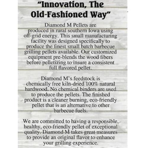 Diamond M’s feedstock is chemically free kiln-dried 100% natural hardwood. No chemical binders are used products e the pellets. The finished product is a cleaner-burning, eco-friendly product that is an alternative to other barbecue fuels.