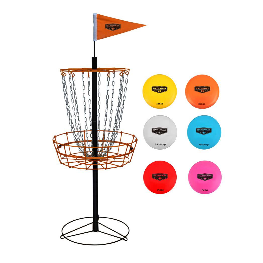 Enjoy hours of fun at backyard barbecues and family gatherings with the Hathaway Disc Golf Set. It is the perfect game for any outdoor event. This challenging game involves concentration and strategy, yet promises fun and engaging competition for players of all ages. This set comes complete with everything you need to play the game. The heavy-duty steel target consists of 12 deflecting chains and a 24 in. scoring basket. The set comes with 6 discs featuring contoured edges that are weighted and balanced for ideal grip and accurate flight. Designed to handle any specific shot required – putt/approach mid-range and long-range shots. Extremely quick to set up or take down and fits nicely in the convenient rip-resistant nylon carry bag.