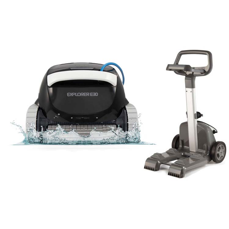 Sit back and relax while the Dolphin Explorer E30 with Universal Caddy cleans the pool for you. Ideal for in-ground swimming pools up to 40 feet, this easy to use, compact cleaner will have your pool ready for splashing fun in just 2 hours. No extra stuff needed. Unlike the energy hogs that are pressure and suction cleaners, Dolphins are extremely energy efficient and do not require any additional equipment to get the job done. Just plug it in, drop it in, and walk away for a sparkling clean pool. The simple way to a clean pool. Agile and efficient, the Explorer E30 was designed to effortlessly clean your pool. With superior filtering and scrubbing capabilities, you can relax knowing your pool’s floor, walls, and waterline are left exceptionally clean. Clean your pool with the touch of a button. Schedule the Explorer E30 to automatically clean your pool each week using three settings- every day, every other day, or every 3rd day. Pool cleaning has never been easier. With more than 35 years of cleaning the world’s residential swimming pools, Dolphins provide pool owners with a hassle-free cleaning solution of unmatched performance and longevity. Get back to what really matters- spending time with family and friends. The Caddy makes cleaning your pool even easier by enabling you to just wheel out your cleaner to your pool instead of carrying it. Make cleaning your pool a breeze with the Explorer E30 and Caddy!