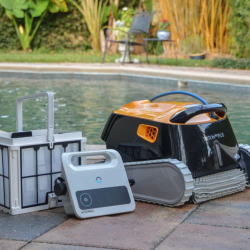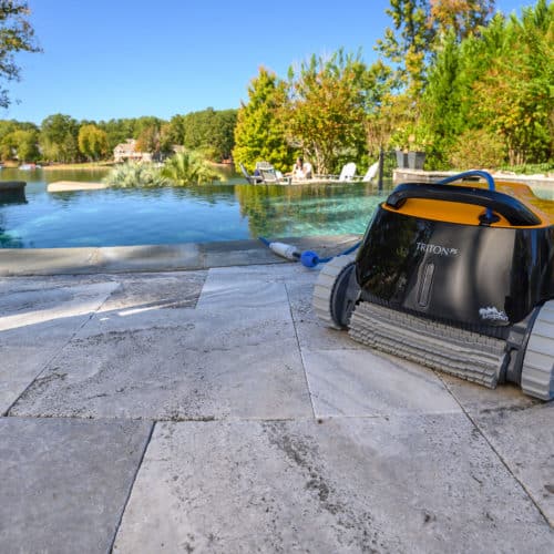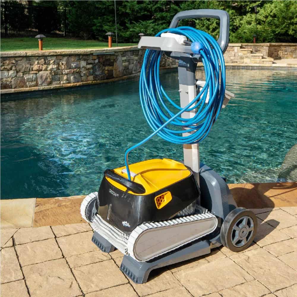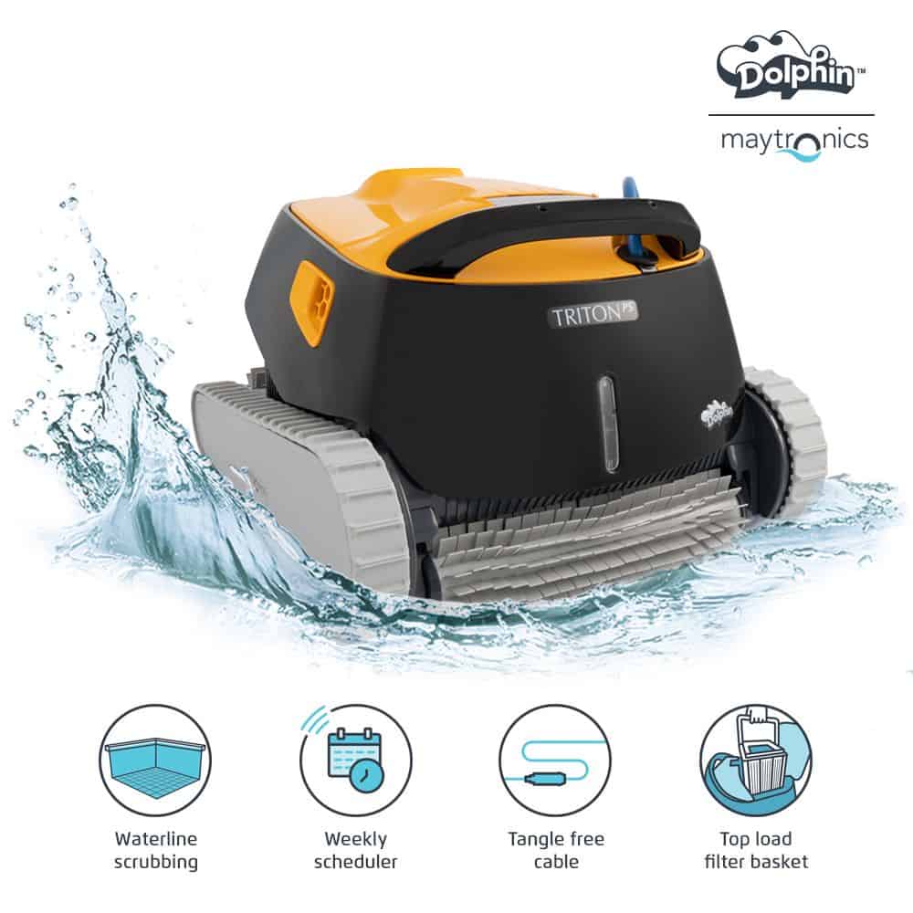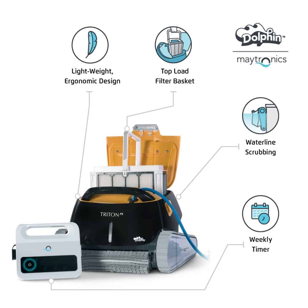 Lighter, smarter, and more powerful! The newly designed Dolphin Triton PS Robotic Cleaner from Pool Warehouse is the answer to your pool cleaning needs! The new PowerStream Technology ensures superior wall and tile cleaning like never before. As the cleaner moves vertically up the wall, water is propelled out in multiple directions creating a constant grip. This enables precise cleaning while moving along the water line. The Triton with PowerStream also features active brushing which means the large brushes spin two times the speed of the robot, removing the most difficult, and stuck-to-the-wall contaminants. One of the obvious differences in this cleaner is the completely different body style. The Triton with PowerStream now has a large, hinged top cover that lifts upwards to reveal an extra-large capacity filter basket which is easily removed and cleaned. The floats were also removed since the PowerStream Technology enhances the climbing and maneuverability. Another notable visual difference is the lack of a swivel on the cable for the Triton with PowerStream. This is because these units utilize software controlled anti-tangling algorithms to prevent the cable from tangling during its cleaning cycle. The weekly timer function allows the Triton with PowerStream to automatically run its programmed two-hour cycle at set intervals throughout the week. This cleaner is also equipped with a fast water release system that removes excess water making sure the cleaner is still lightweight even after completing its cleaning cycle. Backed by a 24 month warranty, the Triton with PowerStream has it all when it comes to robotics.
