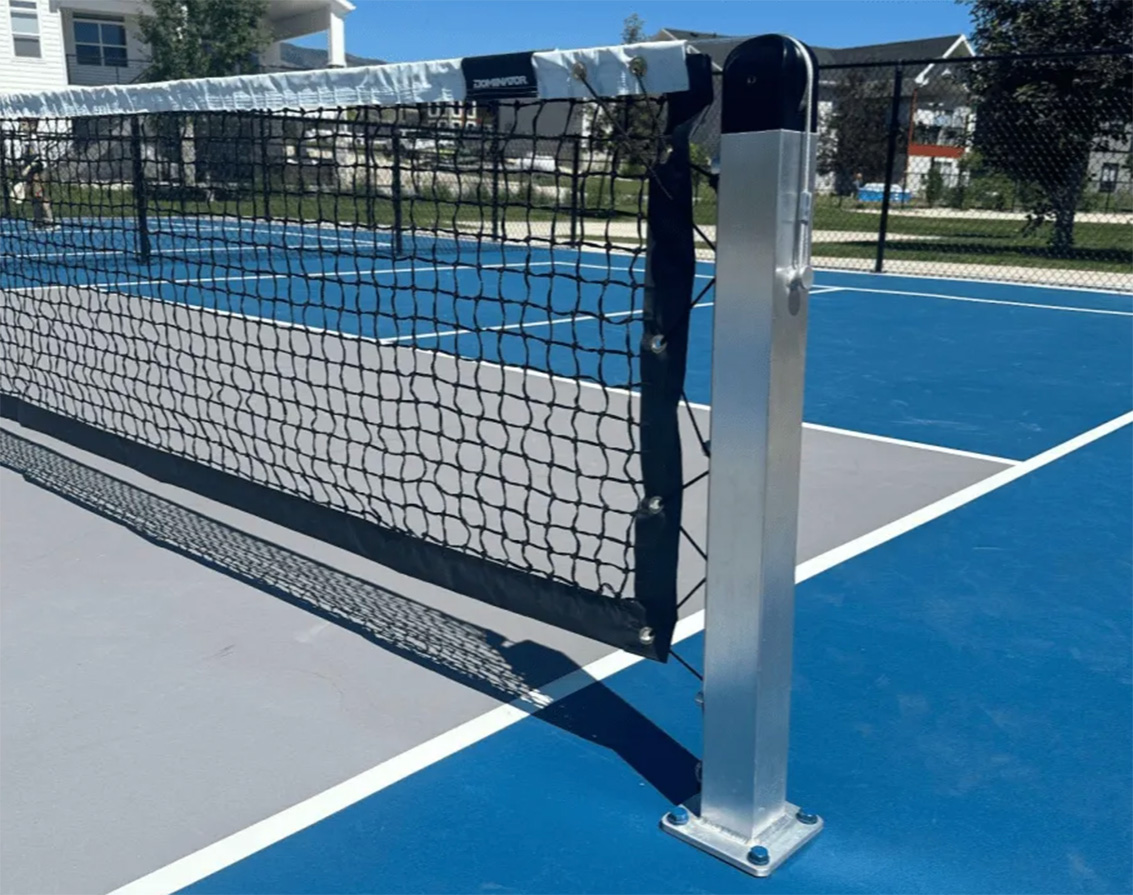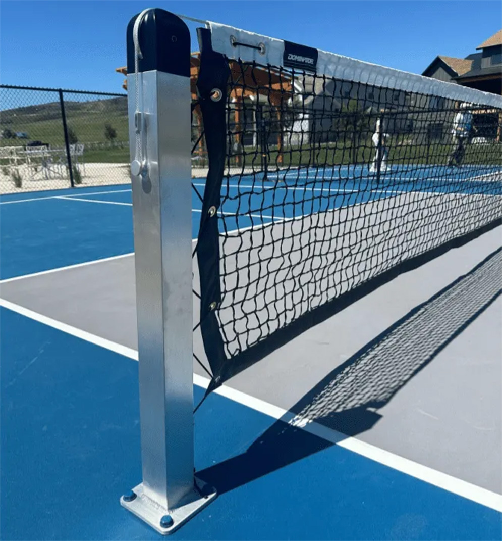 For facility managers, the system offers a compelling balance of performance and low maintenance. Aluminum and stainless steel hardware stand up to rain, snow, coastal environments, and intense sun without flaking or rusting, reducing long-term upkeep compared with painted steel posts. The included net is lightweight enough to remove and roll for storage but robust enough to stay tight and square across the full 22′ post span.