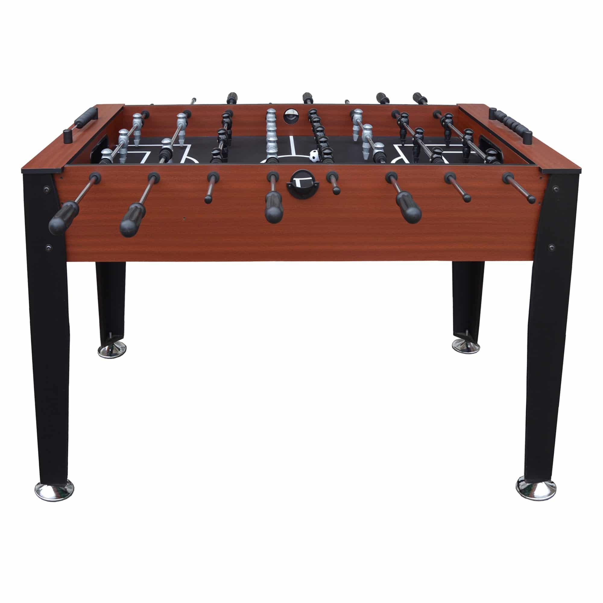 The Dynasty 54 In Foosball Table is guaranteed to bring hours of recreational fun and playful competition right into the comfort of your home. This table is perfect for players of all ages. The cabinet is constructed from durable MDF material and supported by 4 sturdy L-shaped legs with 4″ adjustable leg levelers to keep your table balanced on any surface. Players are made from durable ABS plastic, including a 3-man goalie configuration that heightens the level of competitive table play. Convenient built-in goal boxes help keep the ball in play and the abacus-style slide scorers make keeping score effortless. The attractive dark Cherry exterior cabinet and Black legs combine to create an elegant looking table that plays great. The Dynasty table is an excellent addition to any family game room, garage or man cave. Includes 2 quality foosballs.