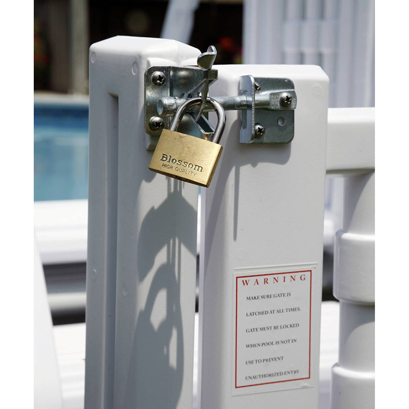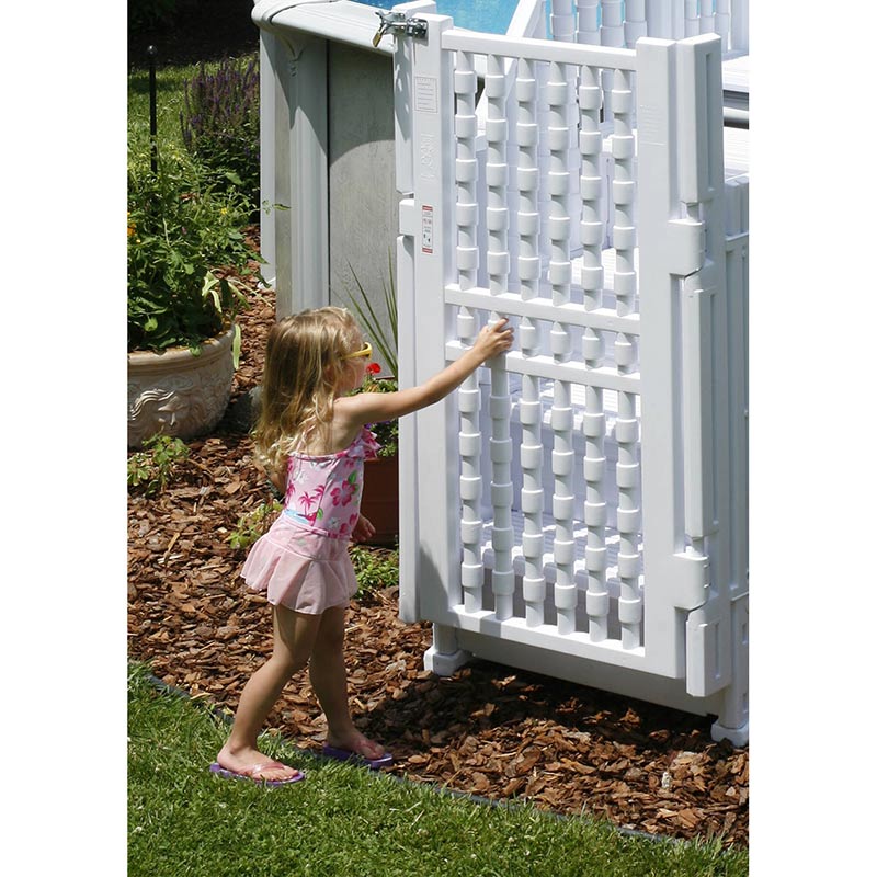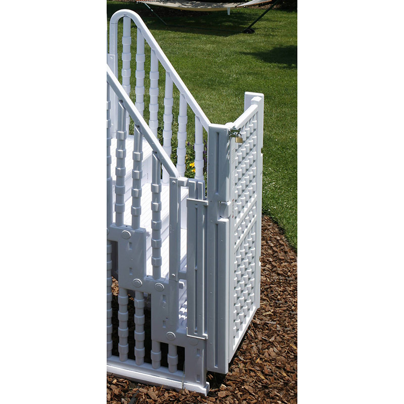 Made from non-corroding vinyl, this 4-step entry system is easy on the legs and its gradual incline means almost anyone can now use the pool. The solid dual handrails and non-skid steps ensure trouble-free use by everyone. Designed to fit 48″ to 54″ pools this system will also fit round or oval pools. The weight of the gate causes it to close if left open. Easy-in Entry System meets all local codes for ladder enclosures and pool entry systems and will support up to 300 lbs.