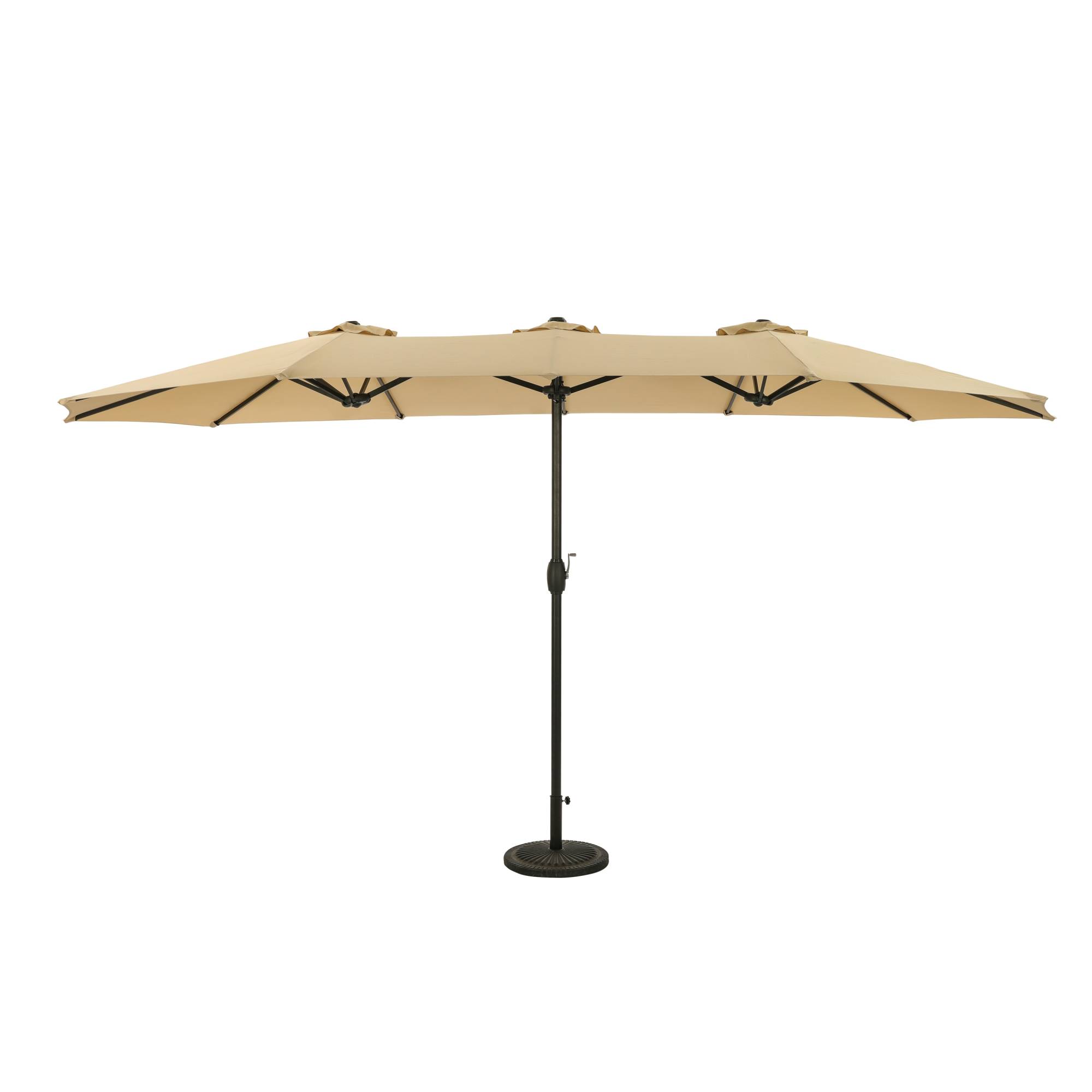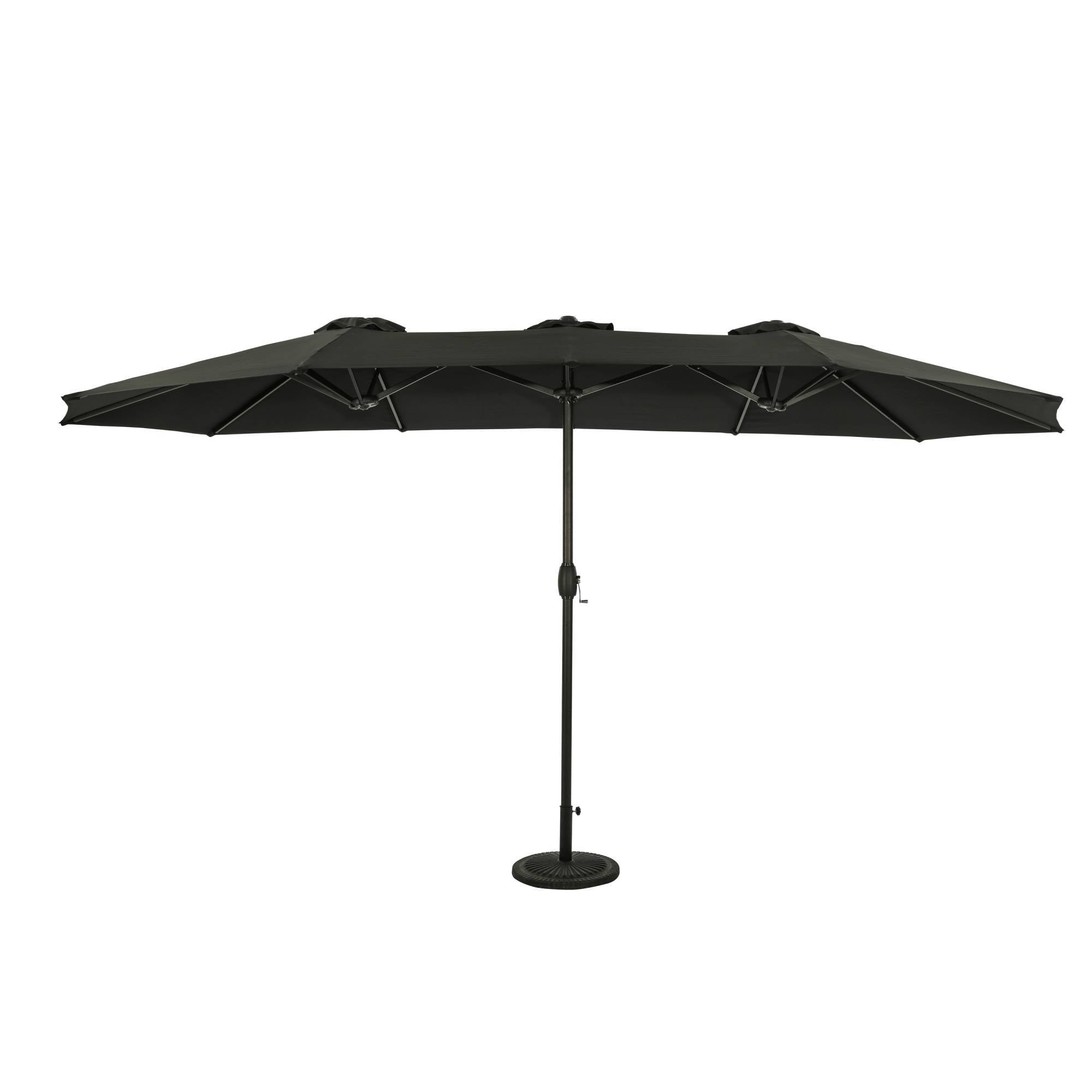 The Eclipse 15-ft Oval Dual Market Umbrella makes the perfect addition to any backyard, patio or deck. Its aluminum rust-resistant pole features a gorgeous, powder-coated bronze-tone finish. This umbrella is also easy to operate, with a simple, intuitive crank that makes it easy to open or close the canopy. The Eclipse’s sturdy, steel 16-rib canopy support system is covered in fade and weather-resistant polyester fabric. This durable material provides up to 135 square feet of relaxing shade. Three wind vents allow air to escape freely, limiting damage from powerful winds. The Eclipse umbrella is backed with a 1-year warranty on the polyester fabric canopy and a 1-year warranty on the pole and structure. Base sold separately.