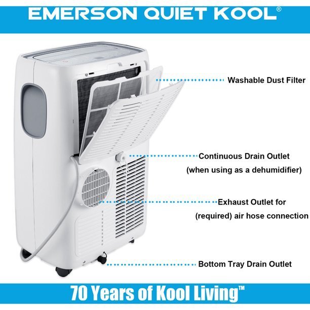 Enjoy flexible, energy-saving, spot cooling with the Emerson Quiet Kool portable air conditioner. With the included window venting kit, it can be easily installed and put into operation anywhere. Using auto evaporation technology, our portable air conditioner also functions as a dehumidifier by reducing unwanted moisture in the air without any necessary drainage. Convenient features include a remote control, 24-hour on/off timer, and sleep mode. And for Peace of mind, you get our 1-2-5 years warranty: 1 year labor, 2 years parts and 5 years compressor. Emerson Quiet Kool air conditioners are a great way to beat the heat and stay comfortable.