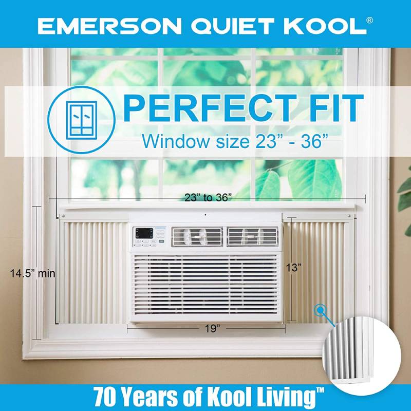 - SMART-FIT SIZING: With dimensions of 16” W x 12” H, this Emerson Quiet Kool window air conditioner was designed with Smart-Fit dimensions, meaning it will fit any 23” to 26” window you have. Included foam insulation with help you retro-fit your sleeve to this new design. Don’t have a sleeve? Remember to check the dimensions prior to purchasing.