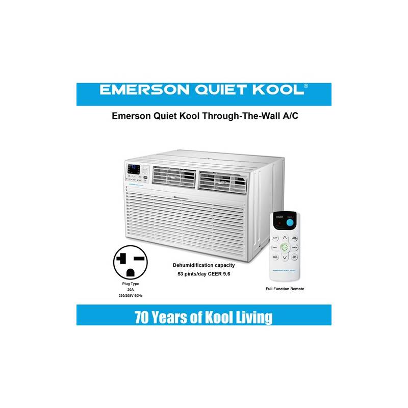 Designed for a room up to 550 square feet, the Emerson Quiet Kool 4-in-1 SMART air conditioner gives you flexible home comfort options. Not only will this unit cool the room with 12,000 BTUs of power, it can also provide 10,600 BTUs of supplemental heating for cool, brisk nights. On top of that, it can also function as a fan for air circulation and a dehumidifier for lowering humidity in the room. With Wi-Fi you can control and monitor your AC with your smartphone while you are on the go or with voice commands at home. This model is designed for through-the-wall installation and is not designed for standard window installation. It will fit most existing wall sleeves and includes a decorative interior trim kit. This unit also requires a special 230-volt/20-amp electrical outlet and will not operate with a standard 115V household electrical outlet. For peace of mind, you get our 1-2-5 years warranty: 1 year labor, 2 years parts and 5 years compressor. Emerson Quiet Kool air conditioners are a great way to stay comfortable.