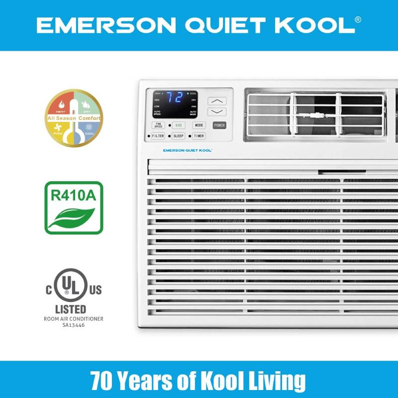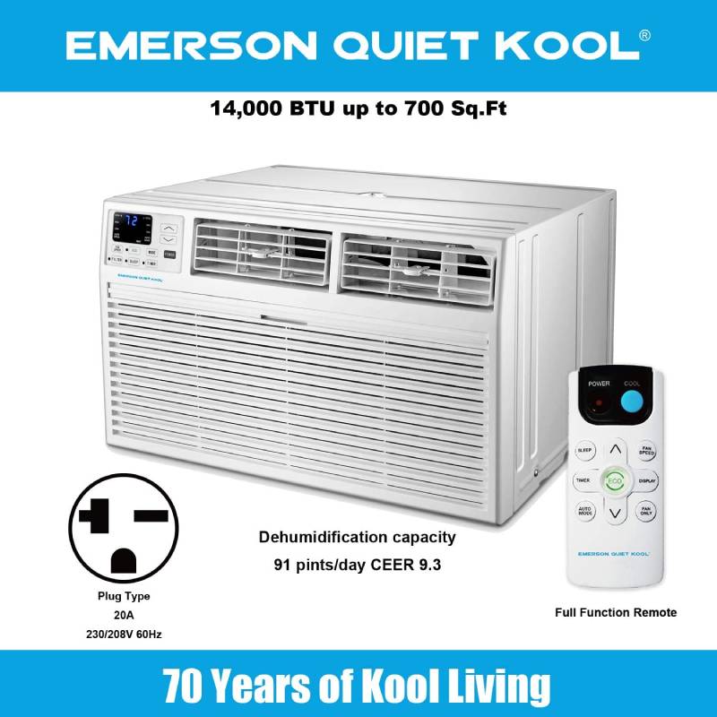 Designed for a room up to 700 square feet, the Emerson Quiet Kool 4-in-1 air conditioner gives you flexible home comfort options. Not only will this unit cool the room with 14,000 BTUs of power, it can also provide 10,600 BTUs of supplemental heating for cool, brisk nights. On top of that, it can also function as a fan for air circulation and a dehumidifier for lowering humidity in the room. This model is designed for through-the-wall installation and is not designed for standard window installation. It will fit most existing wall sleeves (including our competitors) and includes a decorative interior trim kit. This unit also requires a special 230-volt/20-amp electrical outlet and will not operate with a standard 115V household electrical outlet. For peace of mind, you get our 1-2-5 years warranty: 1 year labor, 2 years parts and 5 years compressor. Emerson Quiet Kool air conditioners are a great way to stay comfortable.